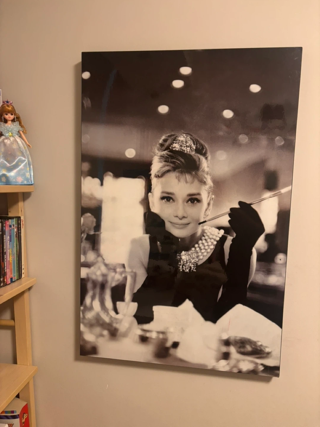 Black and white wall art featuring Audrey Hepburn from the iconic movie "Breakfast at Tiffany's". It's a great statement piece for any fan of classic Hollywood. Who wouldn't want a bit of timeless elegance on their wall! Some wear and tear pictured!
