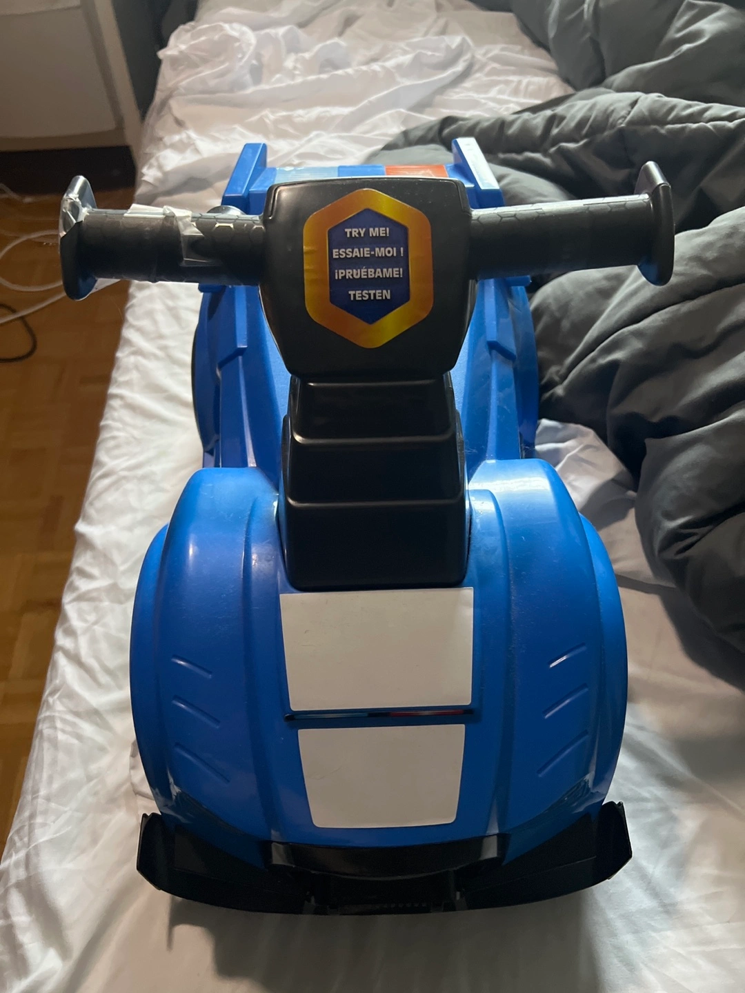 Blue ride-on toy featuring Chase from Paw Patrol. Has a steering wheel and a working horn. Includes a sticker on the side with a paw print.