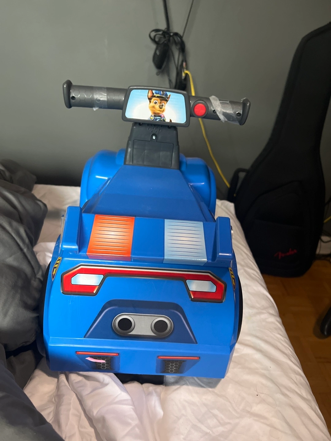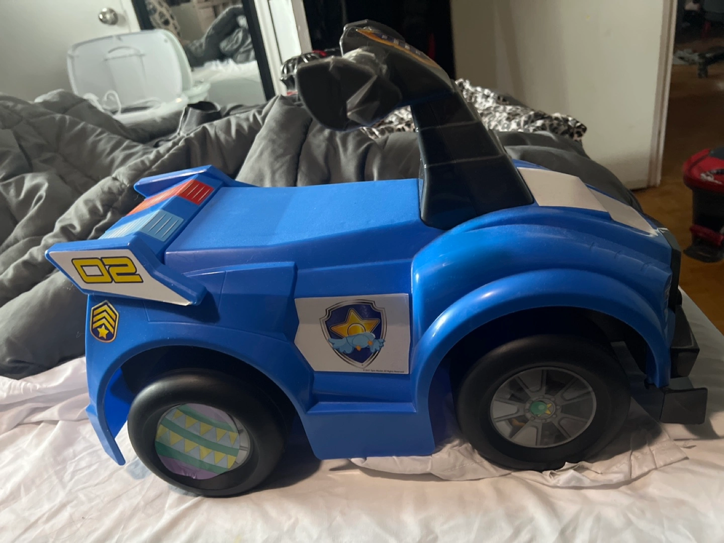 Blue ride-on toy featuring Chase from Paw Patrol. Has a steering wheel and a working horn. Includes a sticker on the side with a paw print.