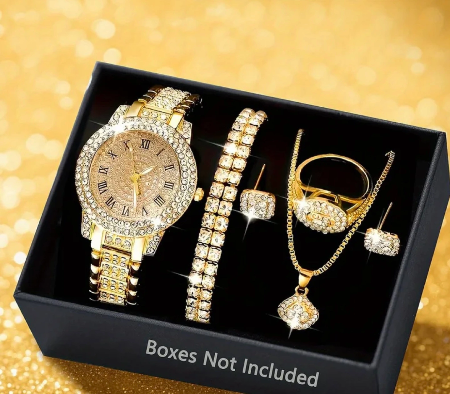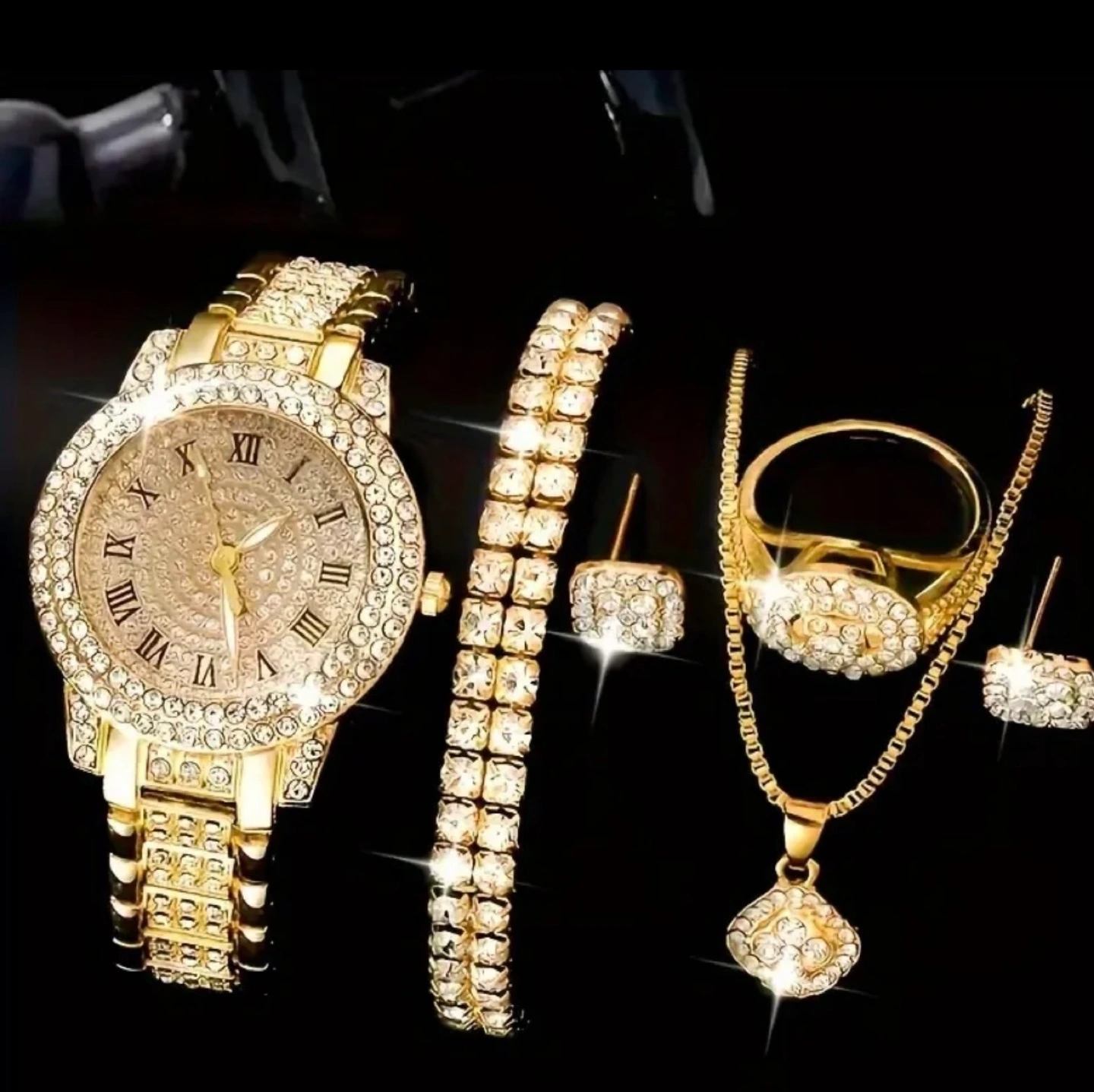 This is a dazzling gold-tone jewellery set. It includes a watch, a bracelet, a necklace with a pendant, and a pair of earrings, all encrusted with rhinestones. This set adds sparkle to any outfit!