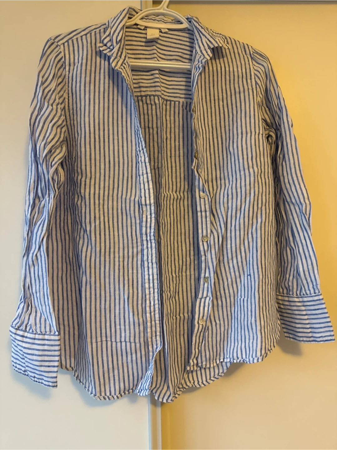 Here's a cute striped long-sleeve shirt from H&M! It's perfect for layering or wearing on its own. The blue and white stripes give it a classic, clean look. It's in great condition and ready for a new home!