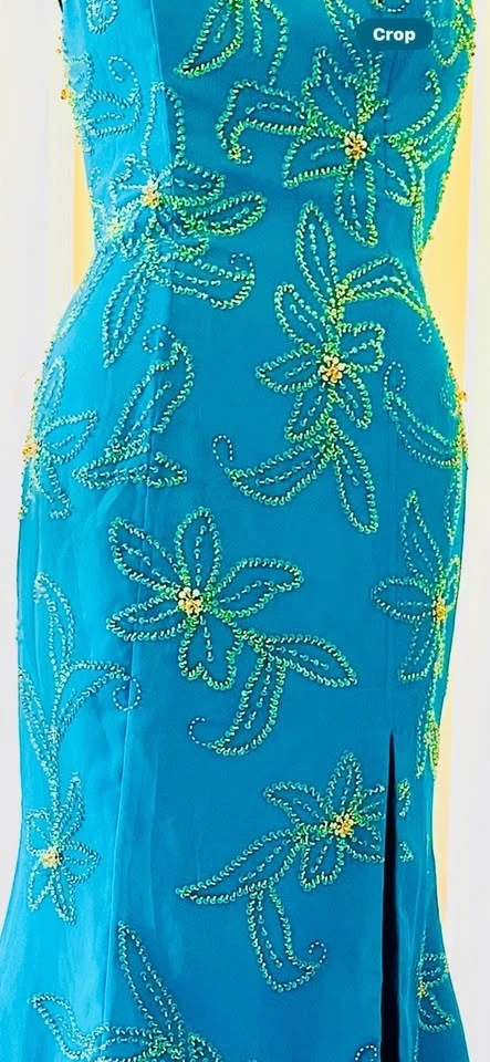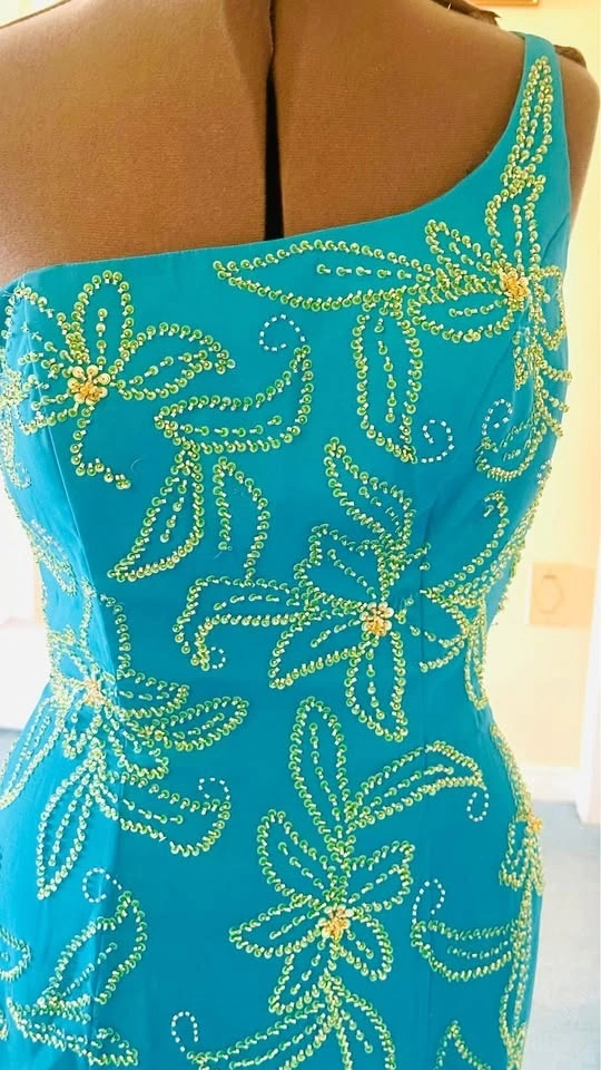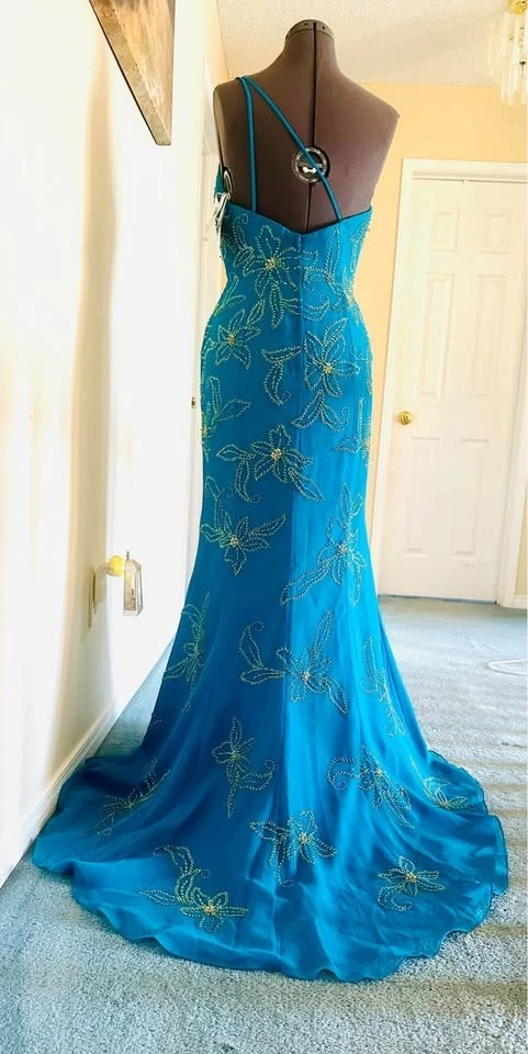 Step into elegance with this stunning Studio 17 blue floral Mermaid one shoulder evening gown. Perfect for special occasions, Prom night, this dress features intricate beaded floral designs that add a touch of sophistication. Brand new with the tags and extra beads and sequins. Beautifully tailored. Above the knee slit. Size 12. The last photo shows the measurements for the size. Non smoking no pets home.