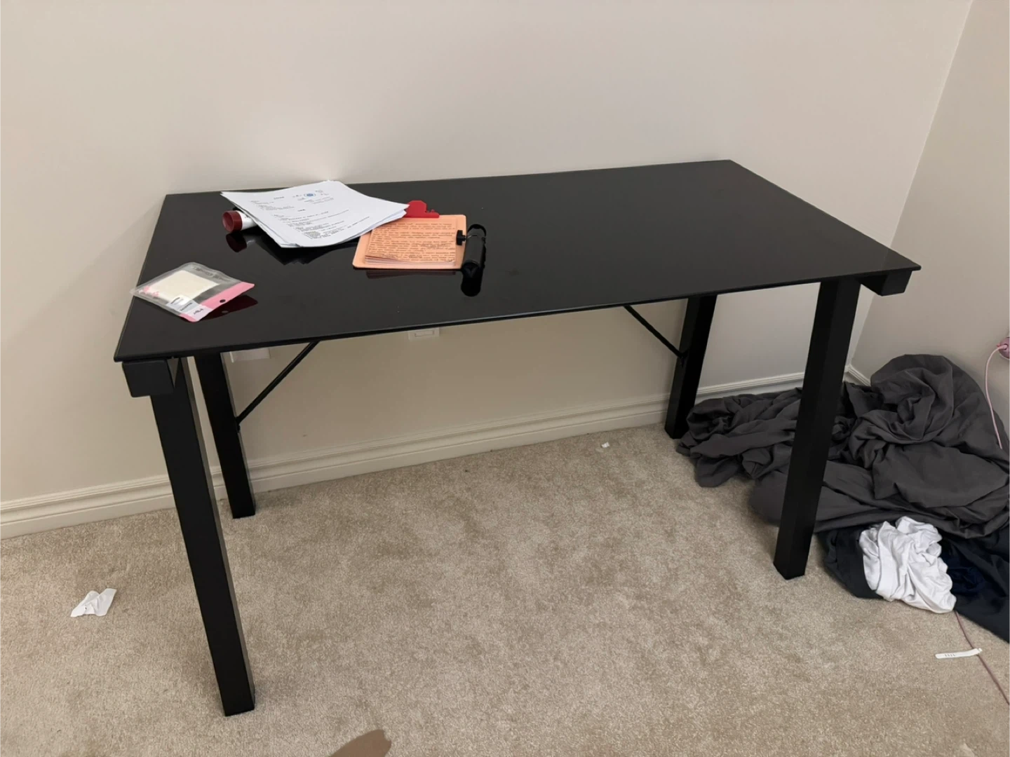 This black glass top desk offers a sleek and modern workspace. It features a durable glass surface and sturdy metal legs. Its simple design makes it suitable for various home office setups.