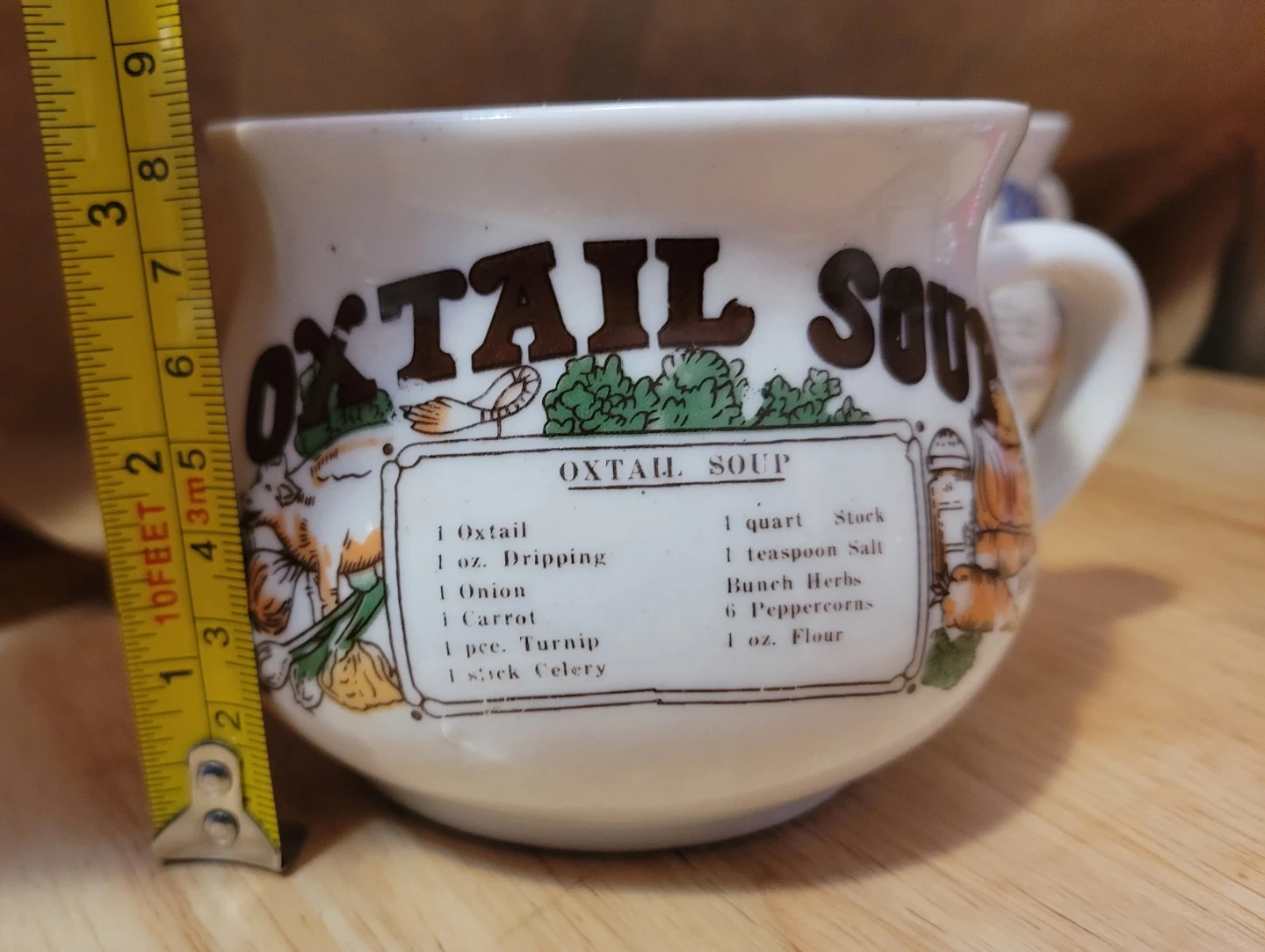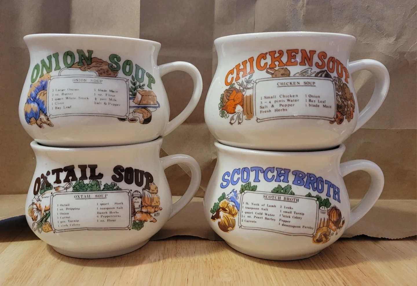Up for sale as a beautiful set of four vintage set of four soup mugs is perfect for any collector or lover of unique dinnerware. The mugs are made of ceramic and porcelain with a stamped-on-bottom China brand. The set includes four mugs in a multicolor design, each with a different soup recipe printed on the side. Each mug displays a recipe for Oxtail, Onion, Chicken, or Scotch Broth soup, making them a perfect addition to any vintage kitchen. The mugs are handmade and have a vintage feel, adding character to any collection. All the bowls are in great condition. No chips or crocs check out the photos. Dishwasher and microwave safe. Made in China. Thanks for looking.