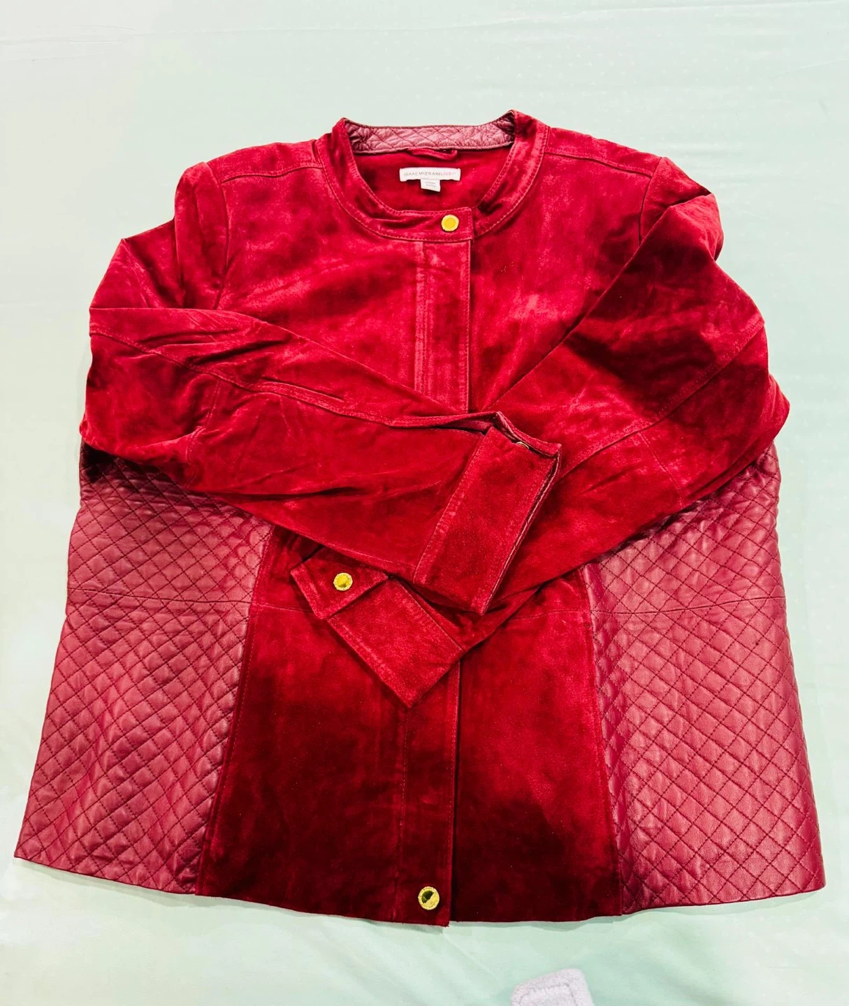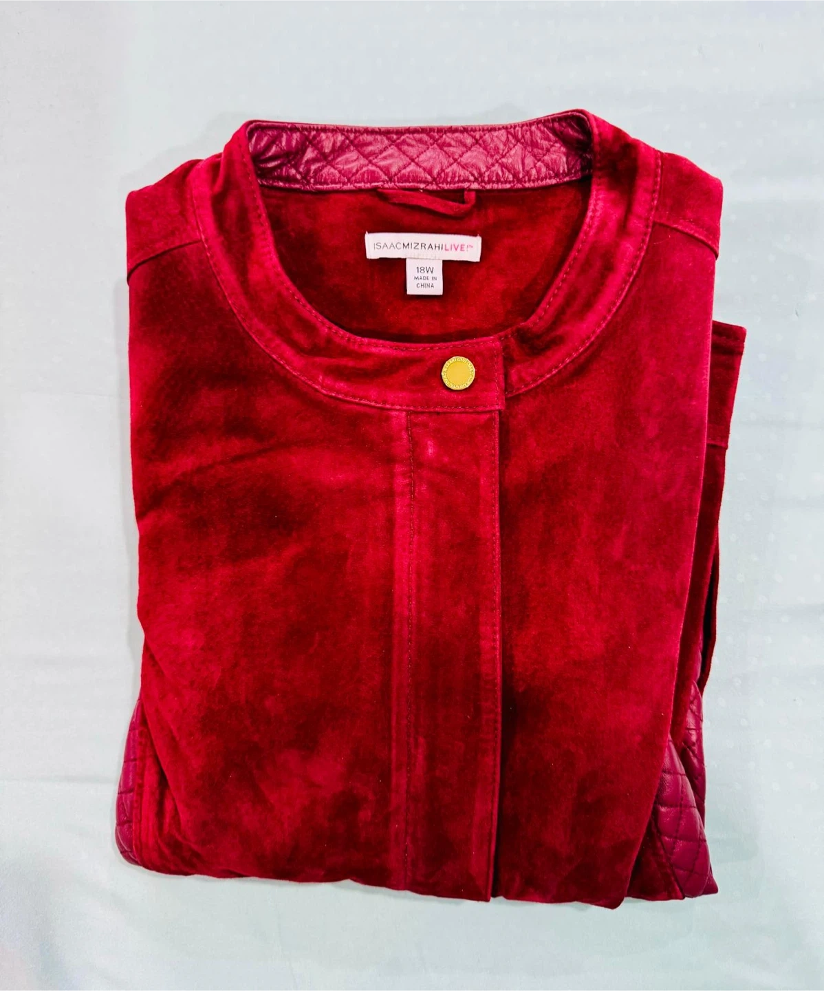 A stylish Isaac Mizrahi jacket featuring red suede and quilted accents. It has a round neckline and gold-tone button closures. Size is 18W