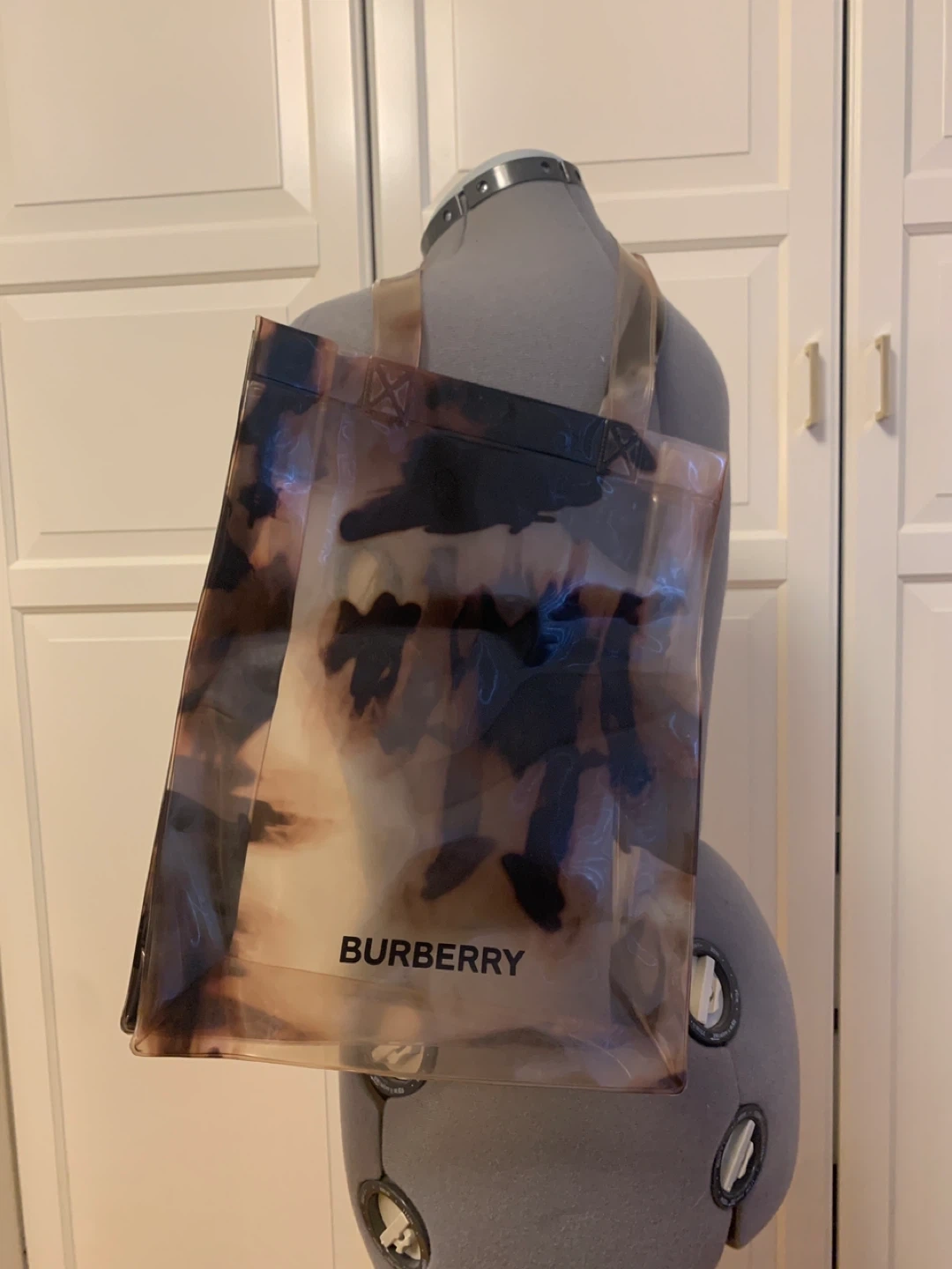 This is a Burberry clear tote bag with a tortoise shell print. It's made of PVC material. Genuine. Never used. Came with a purchase. Fits comfortably over your shoulder. Great for carrying everyday essentials!
