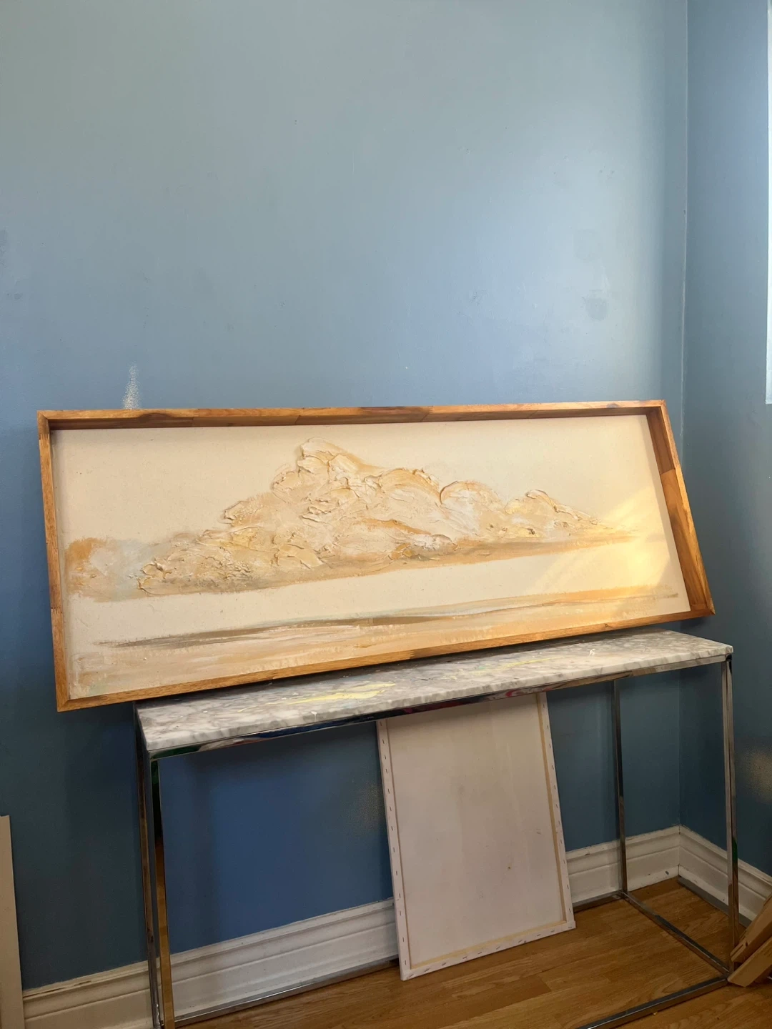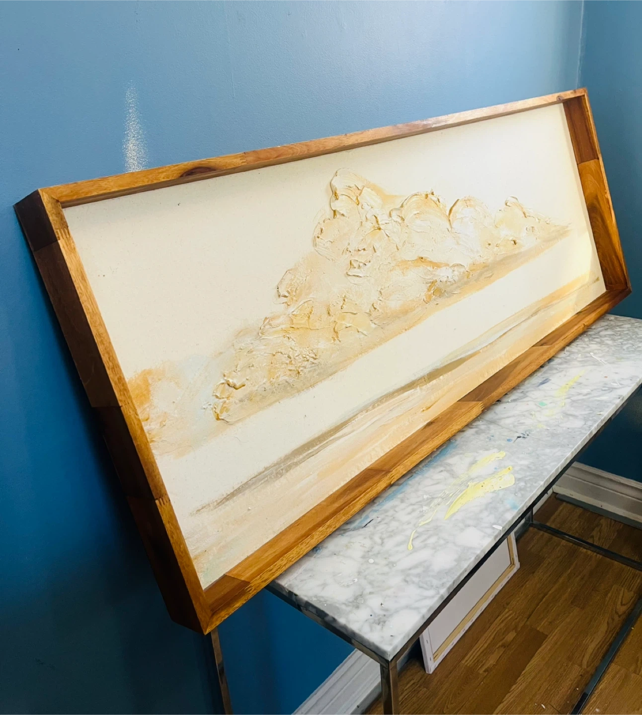 This is a real painting painted by a local artist (me) with textured mediums depicting a cloudscape. It's framed in a real Acacia wood frame. Adds a subtle artistic touch to any room!