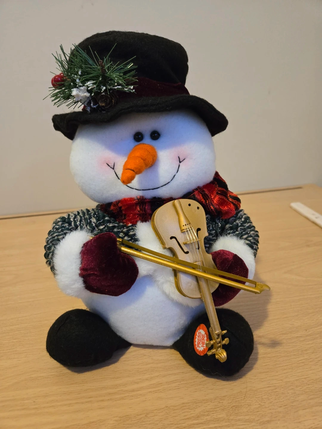 This cute plush snowman is ready for the holidays! It's dressed in a black hat, red scarf, and burgundy mittens. When you press the button, it plays music. Perfect for adding some cheer to your Christmas decor!