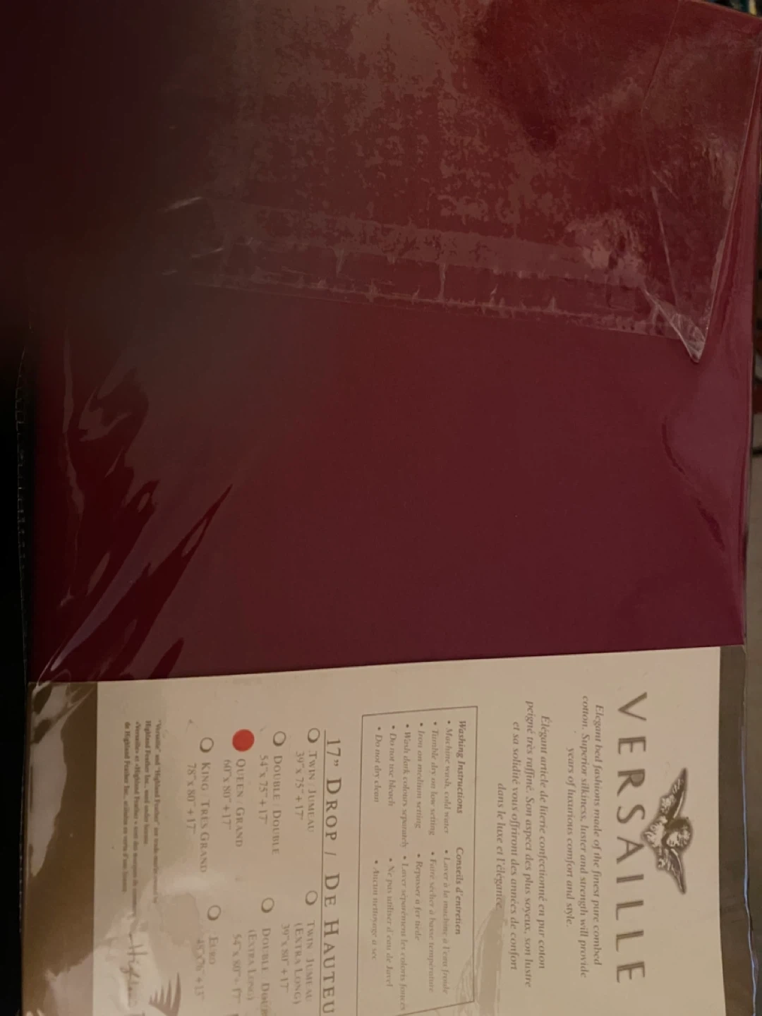 Selling a new Versaille sateen fitted sheet, still in its original packaging! It's a queen size and features a 300 thread count, made with 100% Egyptian cotton. The colour is a rich, elegant red. The packaging indicates a 17" drop, suitable for deeper mattresses. It's machine washable and tumble dry friendly for easy care