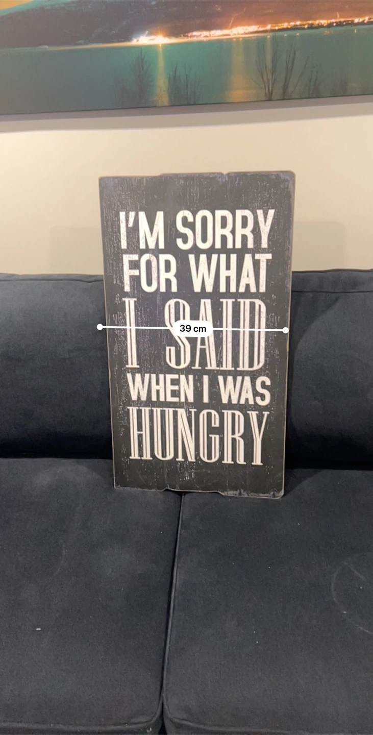 This rustic wooden sign features the humorous phrase "I'm sorry for what I said when I was hungry". It's made of wood and measures approximately 70 cm tall by 39 cm wide. It's a great conversational piece for your kitchen or dining area!
