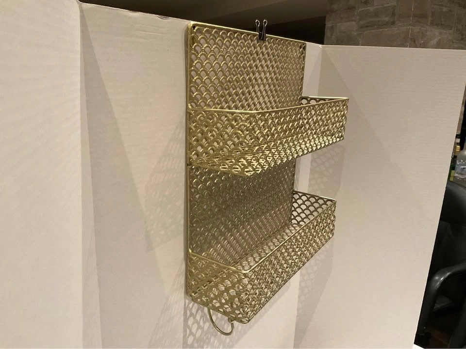 Stylish metal wall organizer with beautiful gold cutouts. Features two handy storage baskets and five hooks on the bottom. Great for your entryway, office, or kitchen. Pristine condition from a smoke-free, pet-free home. Located in Richmond Hill near Bathurst and King Rd.
