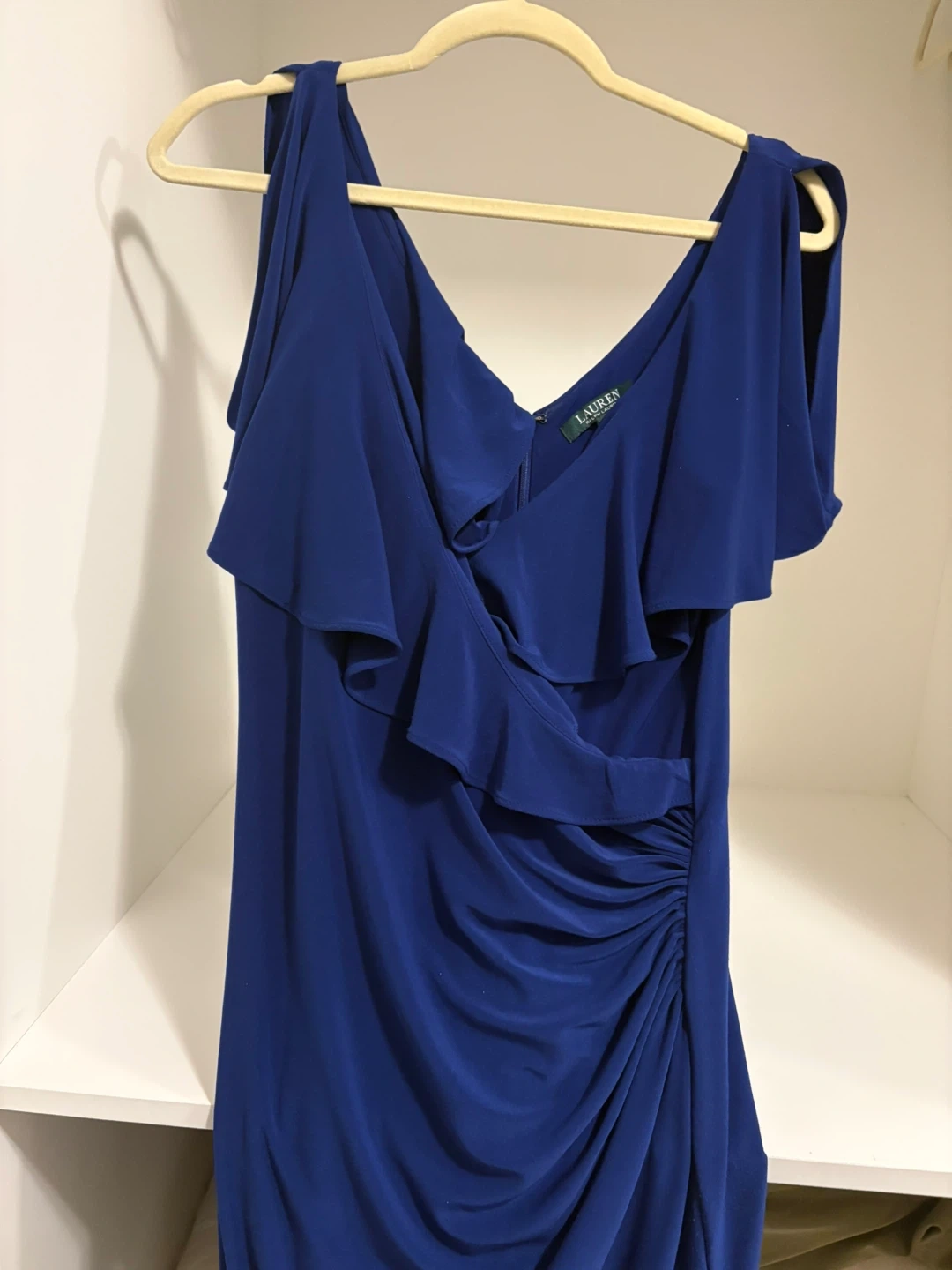 Lauren Ralph Lauren navy blue jersey gown. It features a V-neck with a ruffled overlay and ruched detailing on the side. Made in Vietnam. Size is 8. Perfect for special occasions such as prom, wedding parties, formal events, or evening galas.