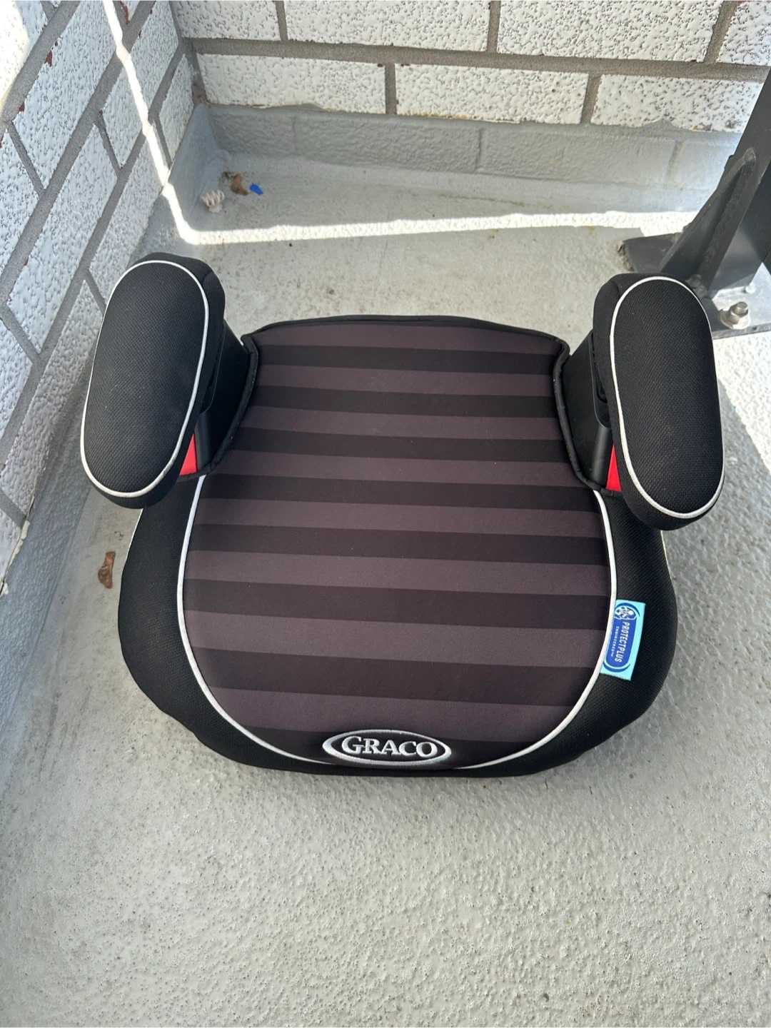 Graco booster car seat for children weighing between 18 kg and 45 kg. It has adjustable armrests. Suitable for children from approximately 4-10 years old.