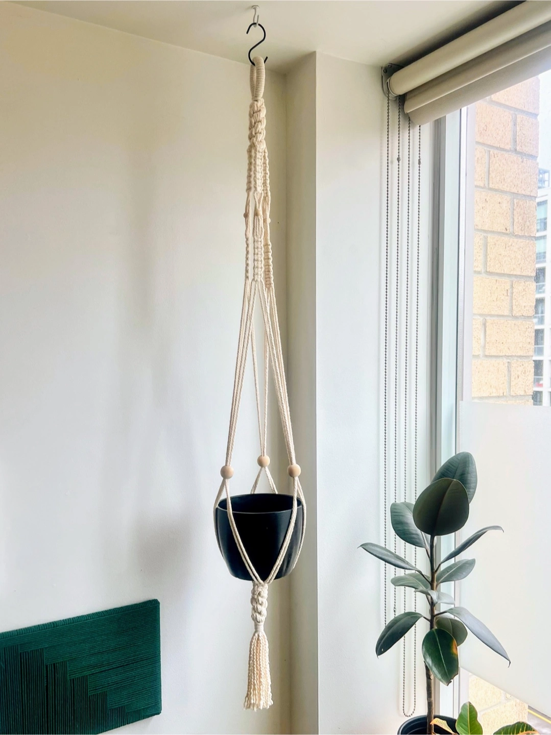 Handmade macrame plant hanger. Natural, cream-coloured cotton cord accented with wooden beads. Perfect for adding a bohemian touch to your home decor.