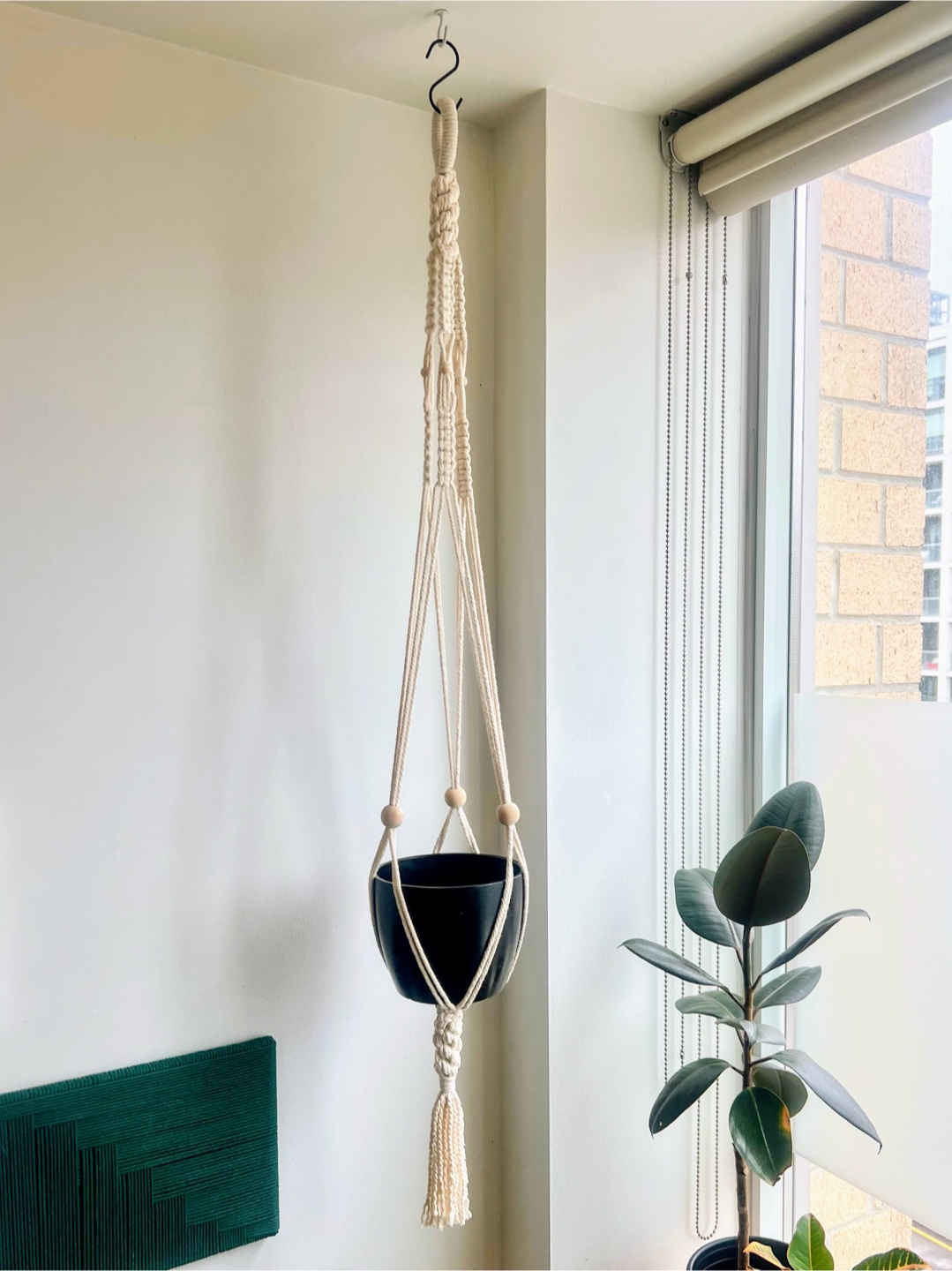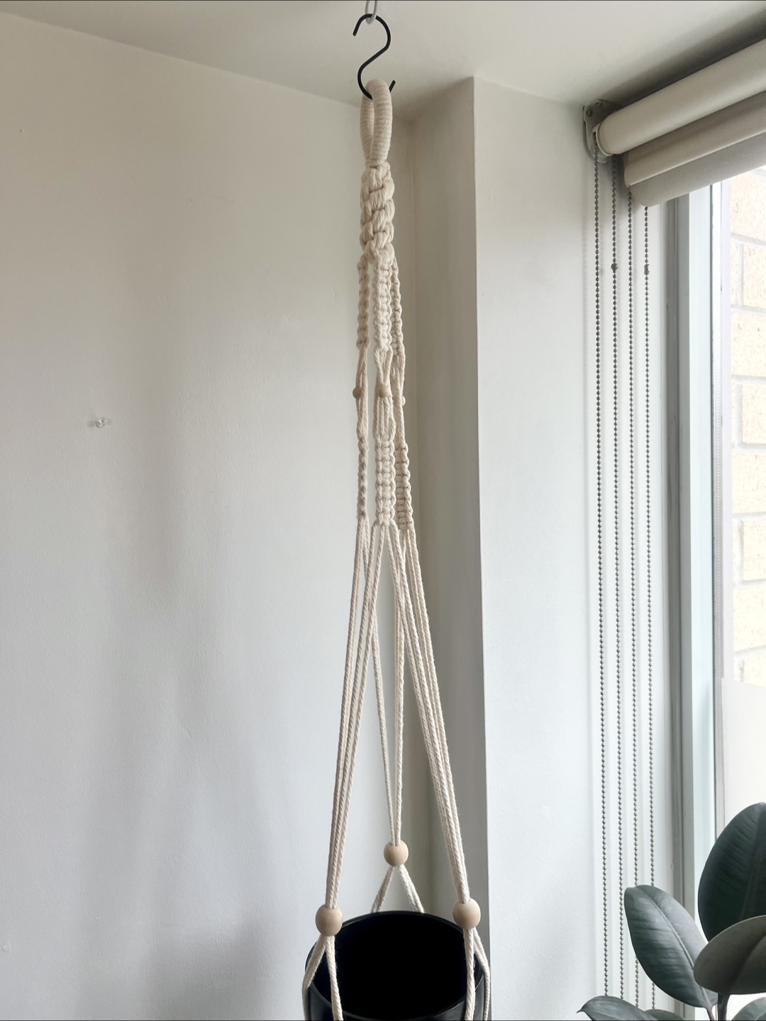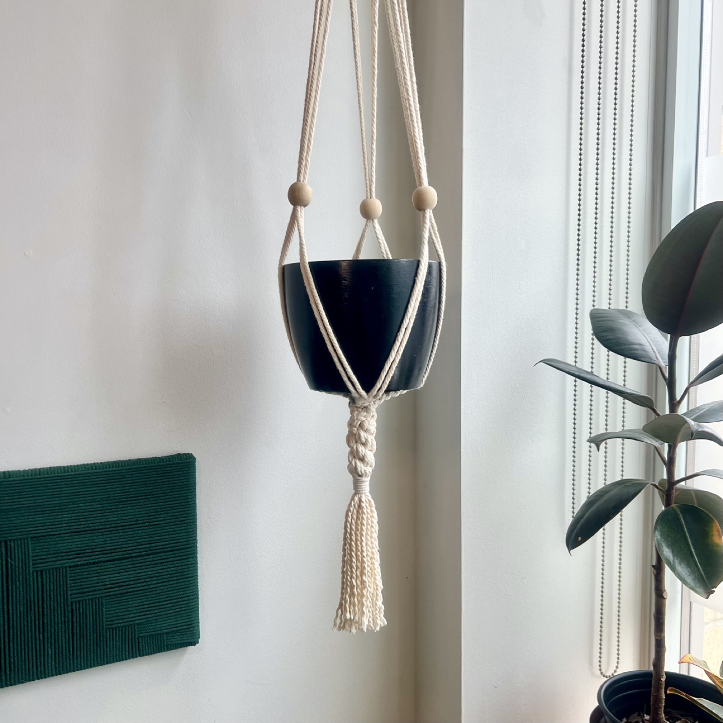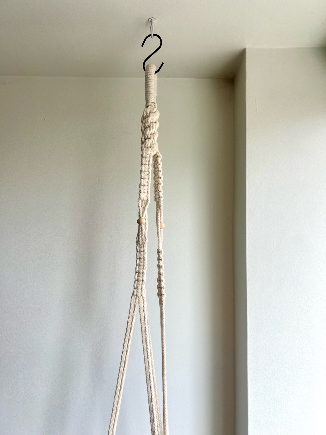 Handmade macrame plant hanger. Natural, cream-coloured cotton cord accented with wooden beads. Perfect for adding a bohemian touch to your home decor.