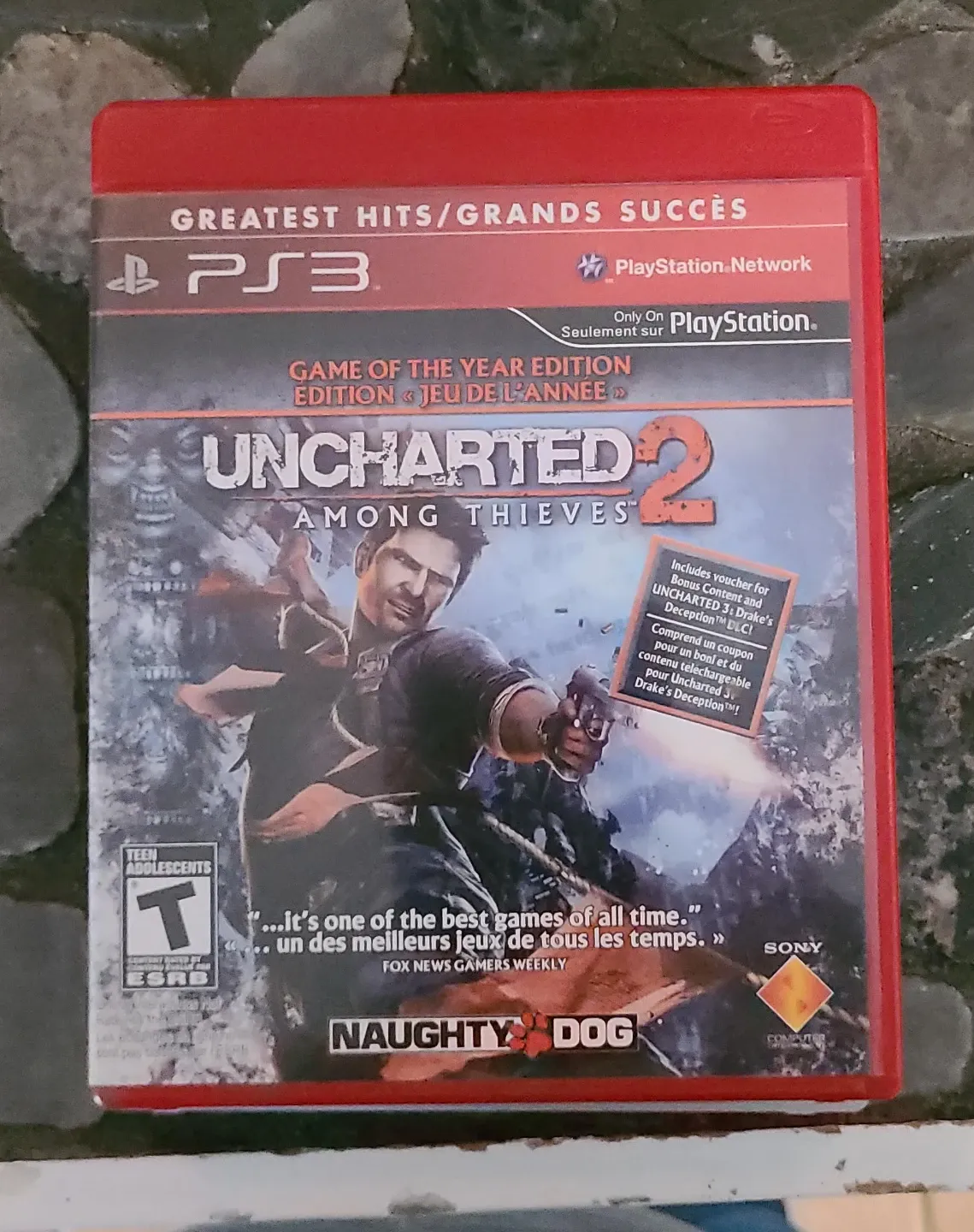 This is the Game of the Year Edition for Uncharted 2: Among Thieves on PlayStation 3. It includes a voucher for bonus content and Uncharted 3: Drake's Deception DLC. It's rated Teen.