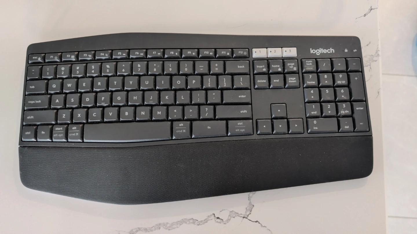 This is a black Logitech full-size keyboard. It features a comfortable padded wrist rest for extended typing sessions. It's a reliable keyboard for everyday computer use.