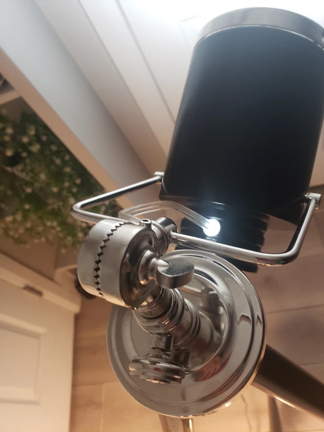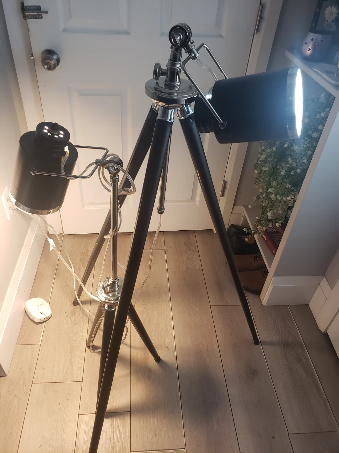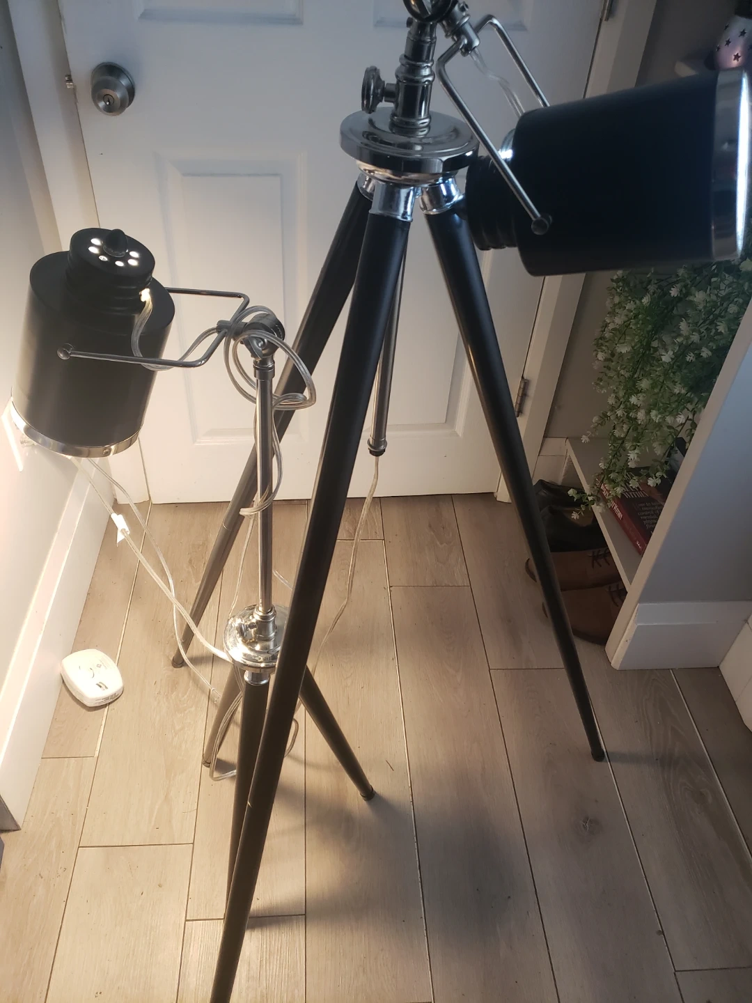 These are 2 black floor lamp with a tripod base. It has adjustable lighting heads and a sleek, modern design. The lamp stands tall, providing ample light for any room.