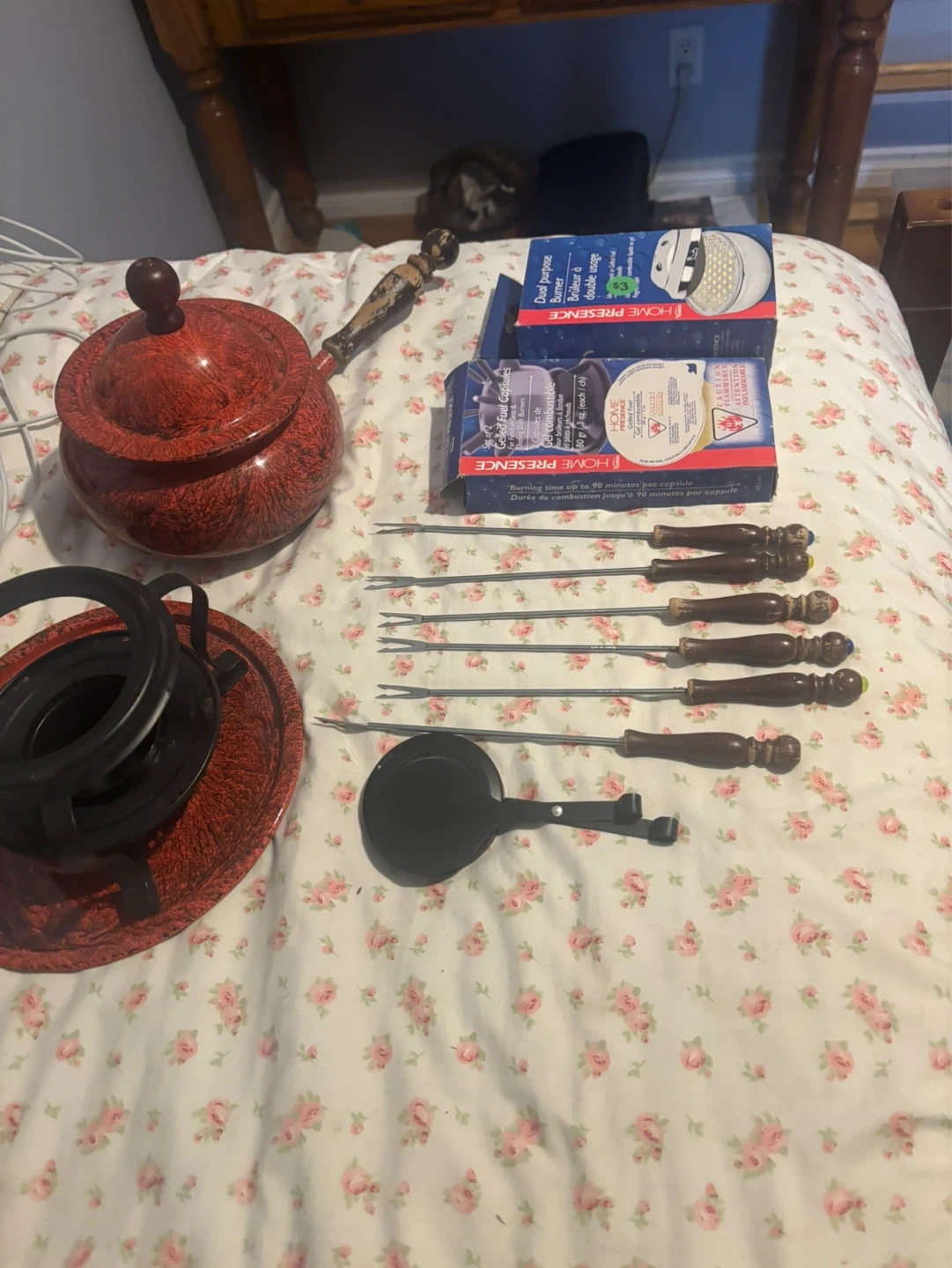 Red speckled fondue pot with wooden handle and lid. Includes a dual-purpose burner, a black pot holder, four fondue forks with wooden handles, and gel fuel capsules. The pot and accessories have a vintage appeal, perfect for cozy gatherings.