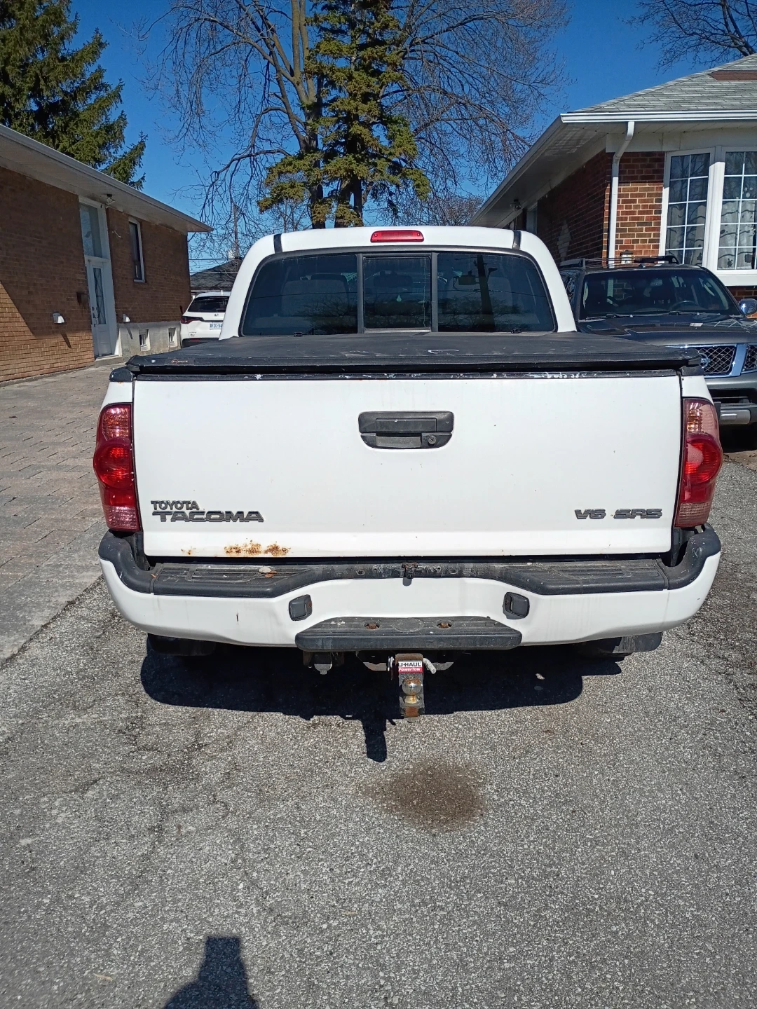 This white Toyota Tacoma TRD Sport is a V6 model. It features a double cab and a bed cover.
