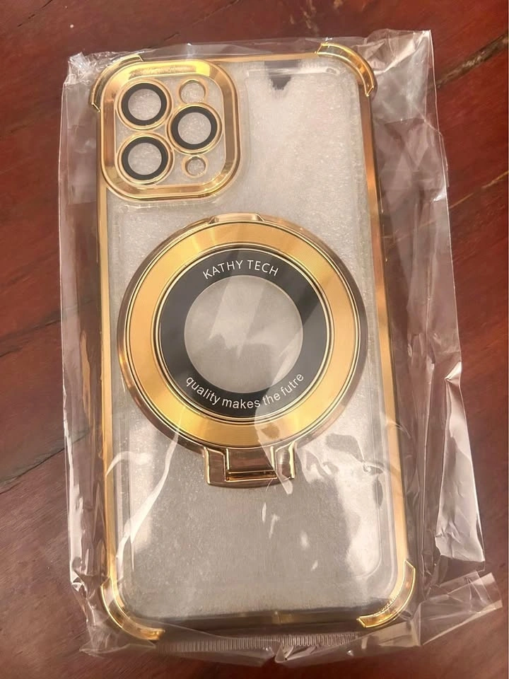 Case for iPhone 11 PRO. Magsafe wireless charging compatible. Bumper on each corner to prevent damage to the screen if the phone falls. Metal ring in the back is good for holding or turns the case into a phone stand (can be used both vertically and horizontally).