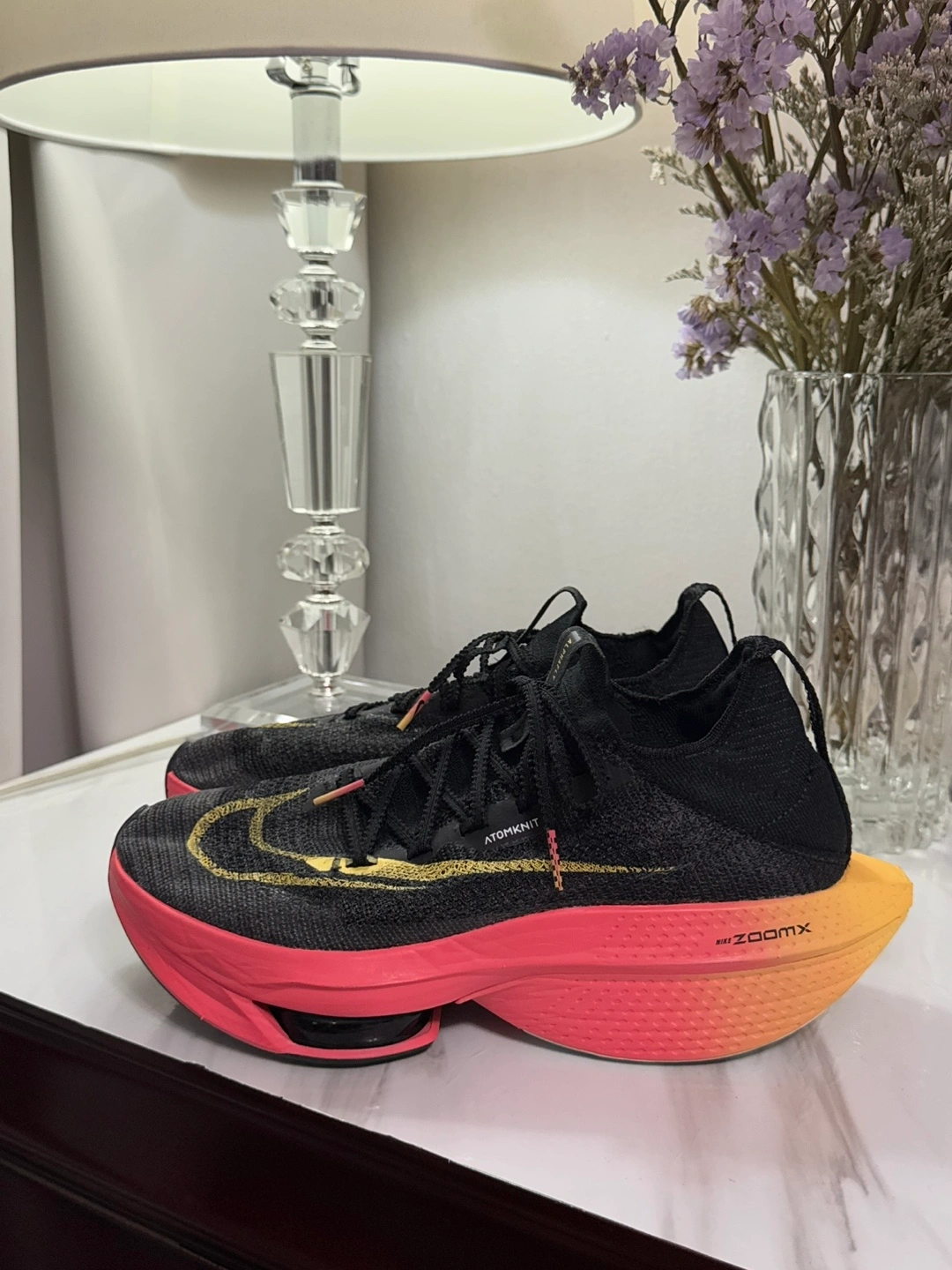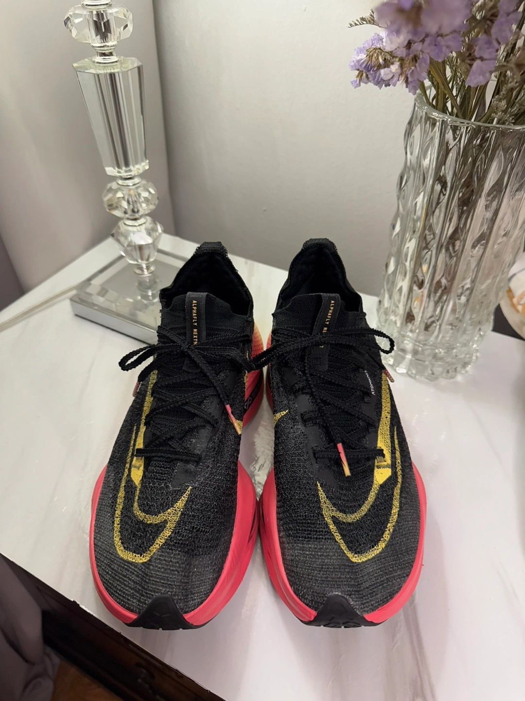 Selling a pair of Nike Alphafly Next% 2 running shoes! They're in great condition and ready for your next run. The shoes feature a black, gold, and pink colour scheme with Nike ZoomX technology. They are designed for speed and performance