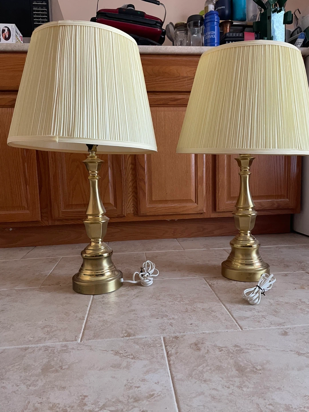 Selling a set of two brass table lamps. Each lamp features a fluted base and a pleated cream-coloured shade. They're a classic design that'll add a warm glow to any room. These lamps are perfect for your living room or bedroom.