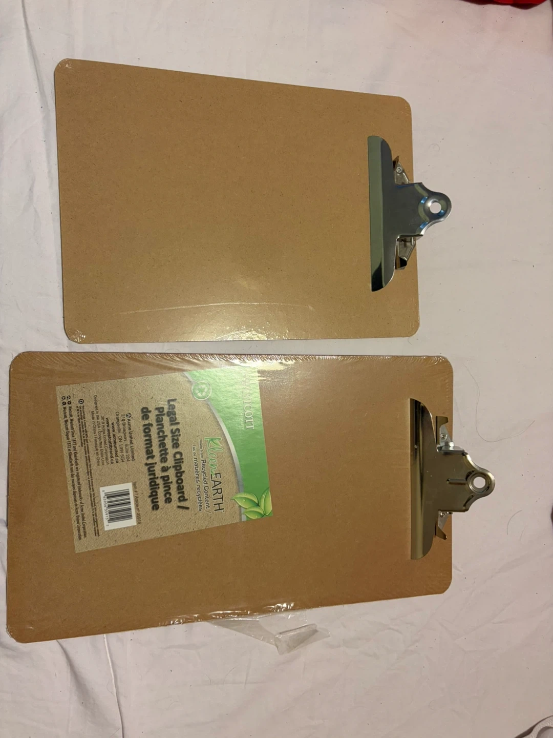 Set of two clipboards- one regular and one legal size. These are made from recycled content. Strong metal clip securely holds papers.