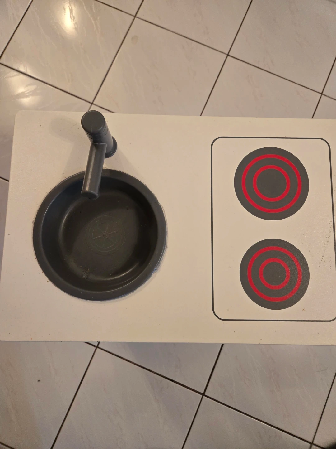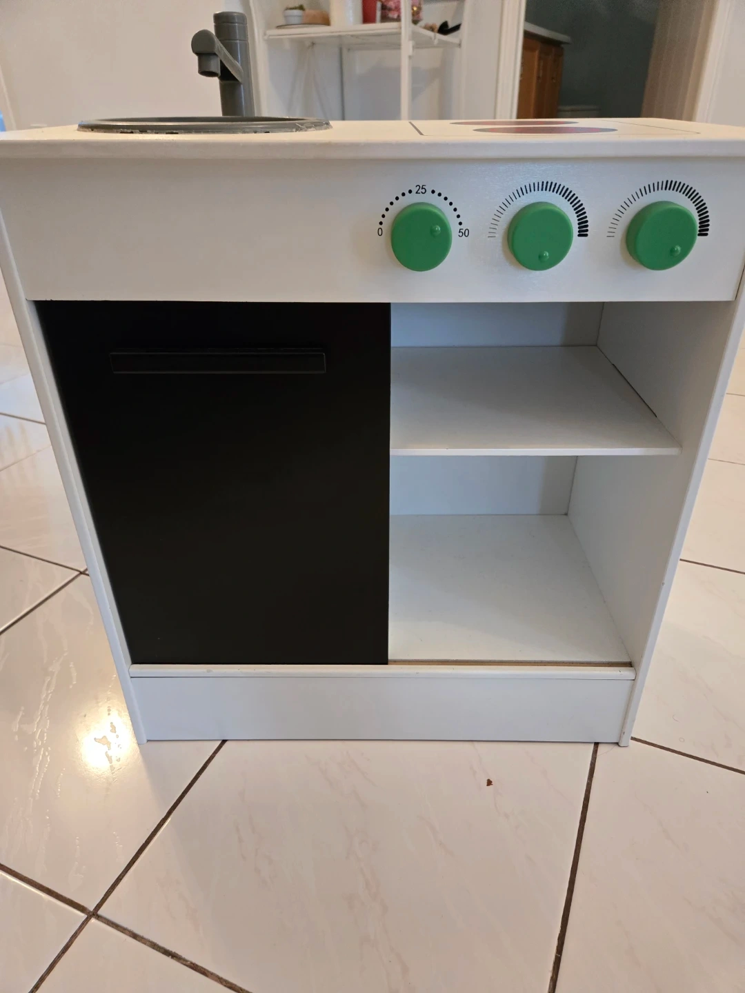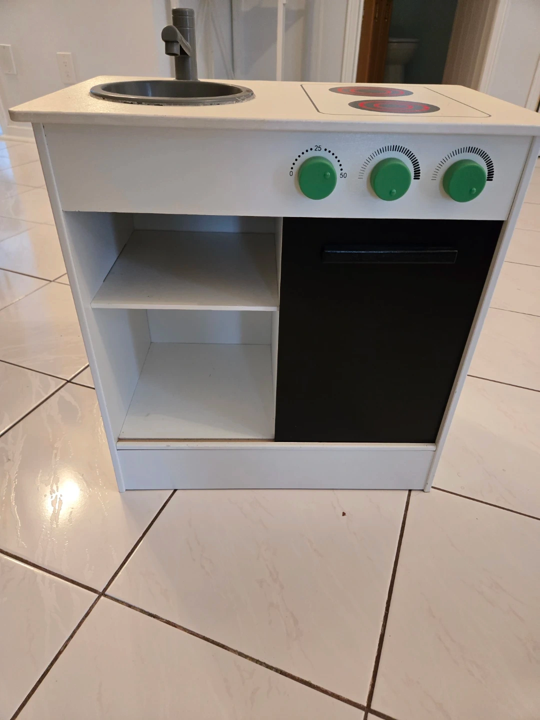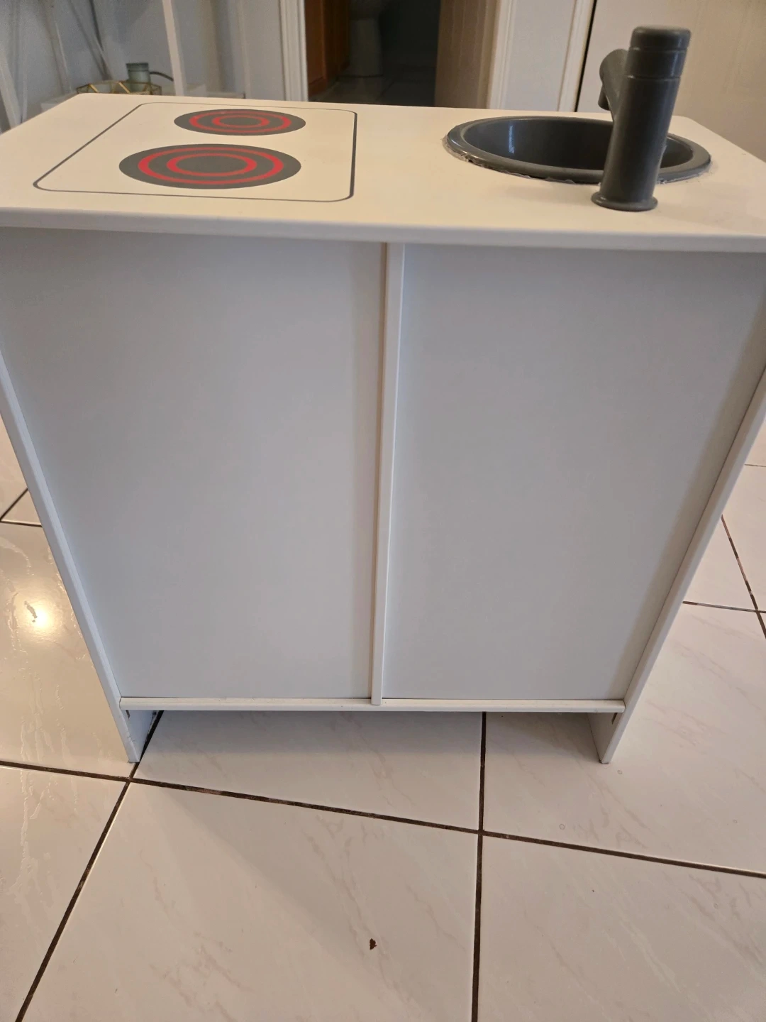 Ikea toy kitchen. Gently used. Please note, the bowl under the faucet area was glued down purposely. No broken areas at all. Slight scuffing due to use.