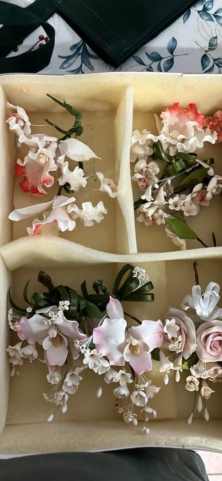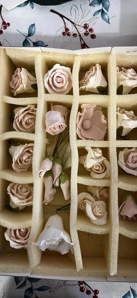 Beautiful box of sugar flowers. Has a bunch of different kinds, like roses, orchids, lilies, and other small floral bits. Colors are super pretty, pastel pink, white, cream, yellow, purple, and some light blue/green. Good for cake decorating, or even wedding projects. All stored nice and neat in foam dividers.