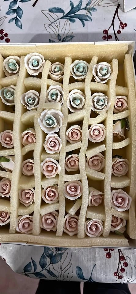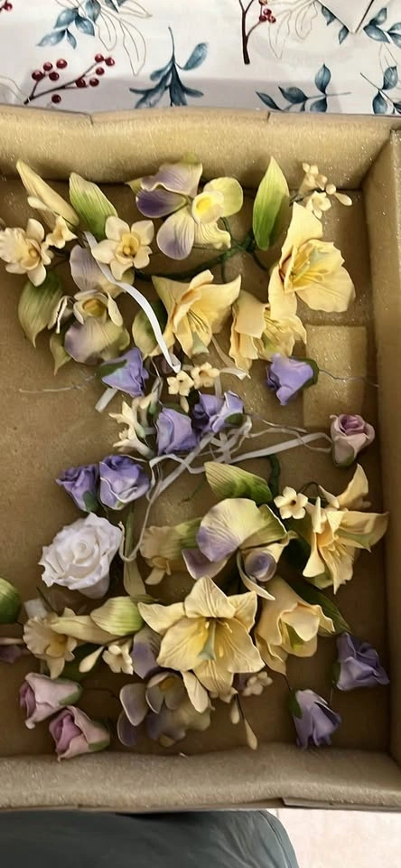 Beautiful box of sugar flowers. Has a bunch of different kinds, like roses, orchids, lilies, and other small floral bits. Colors are super pretty, pastel pink, white, cream, yellow, purple, and some light blue/green. Good for cake decorating, or even wedding projects. All stored nice and neat in foam dividers.