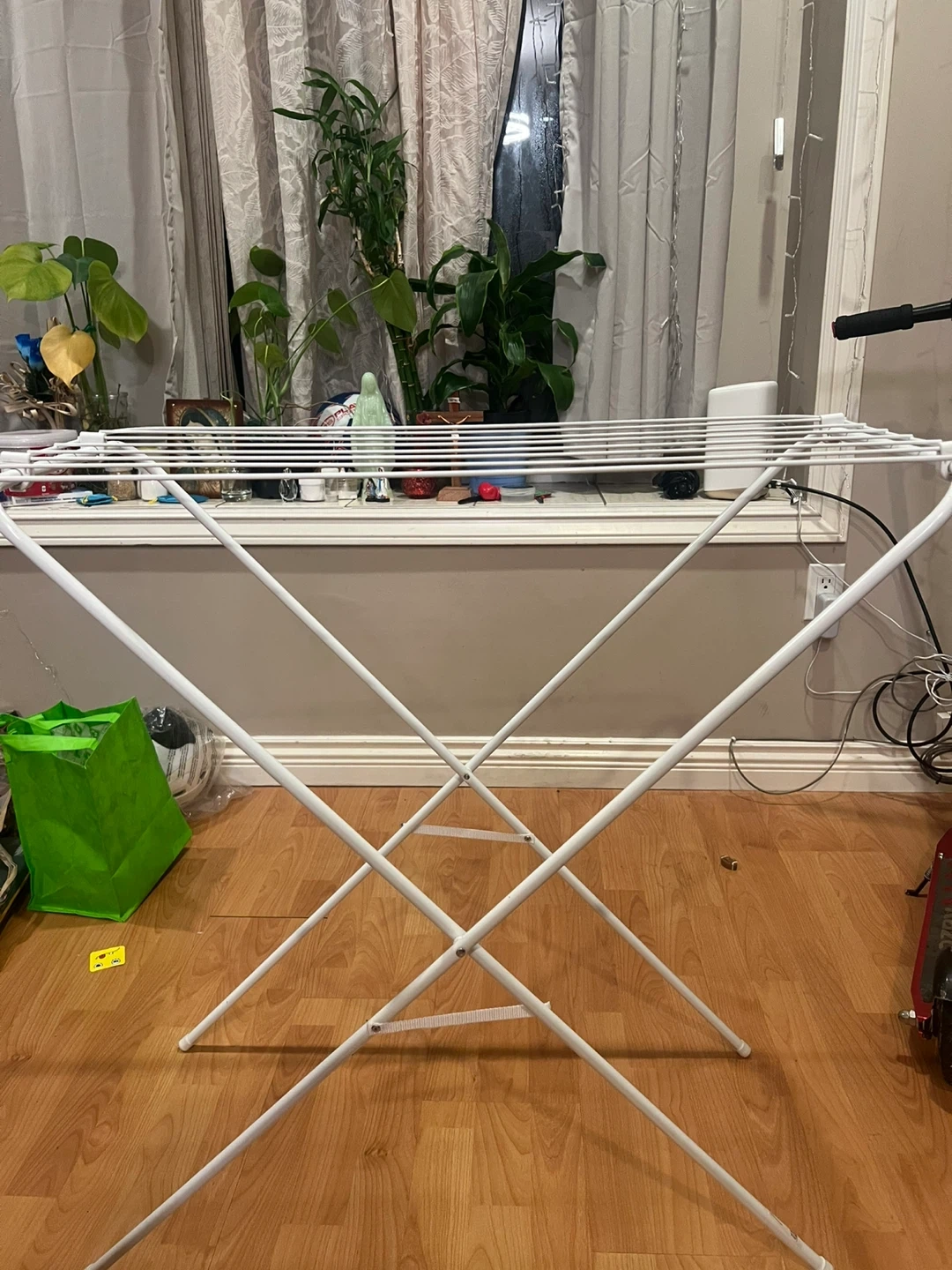 This is a white folding clothes drying rack. It's made of metal and features multiple lines for drying laundry. It's perfect for small spaces or when you need extra drying room. It folds flat for easy storage!
