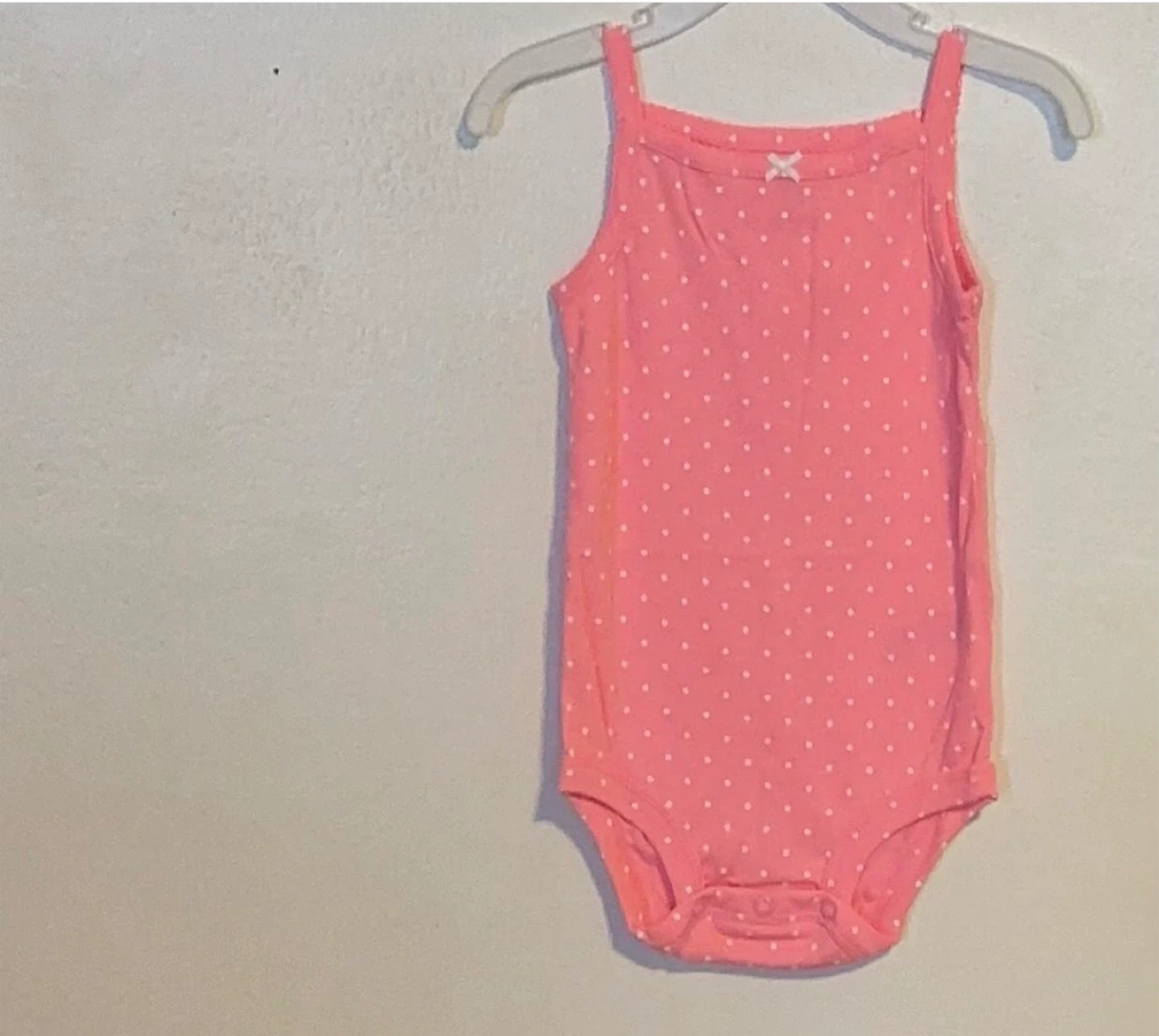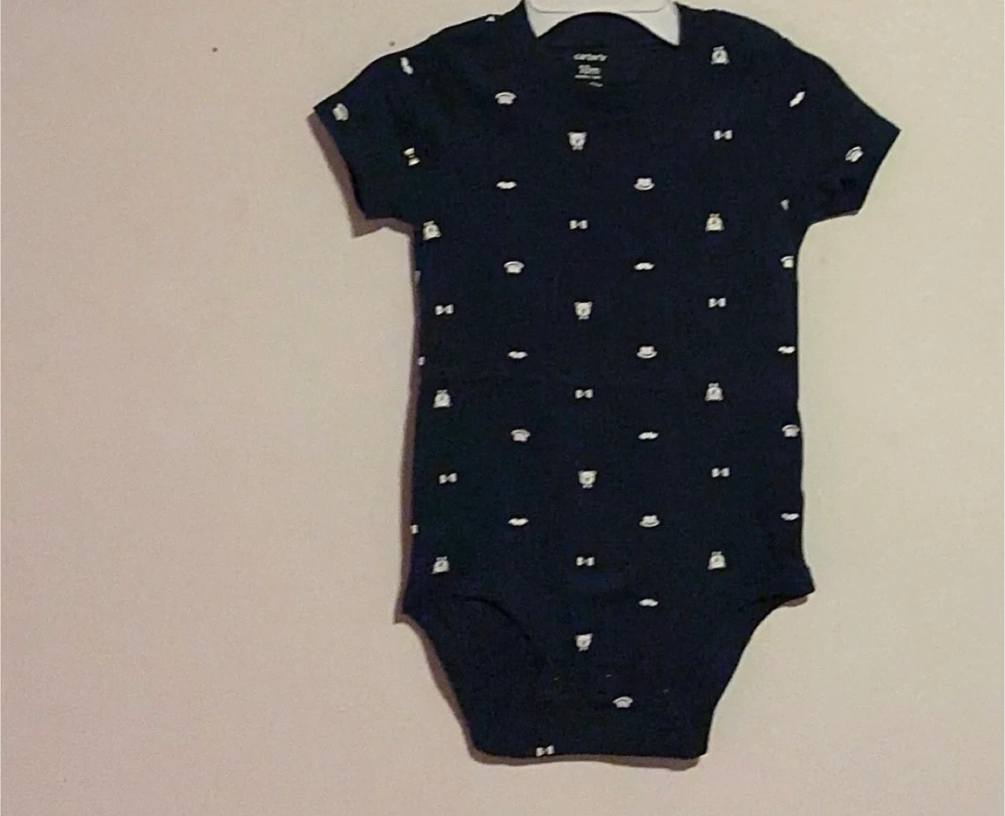 Carters baby bodysuits, one pink with white polka dots and one navy with white patterned print. They're soft cotton, perfect for everyday wear. Includes snaps at the bottom for easy changes.