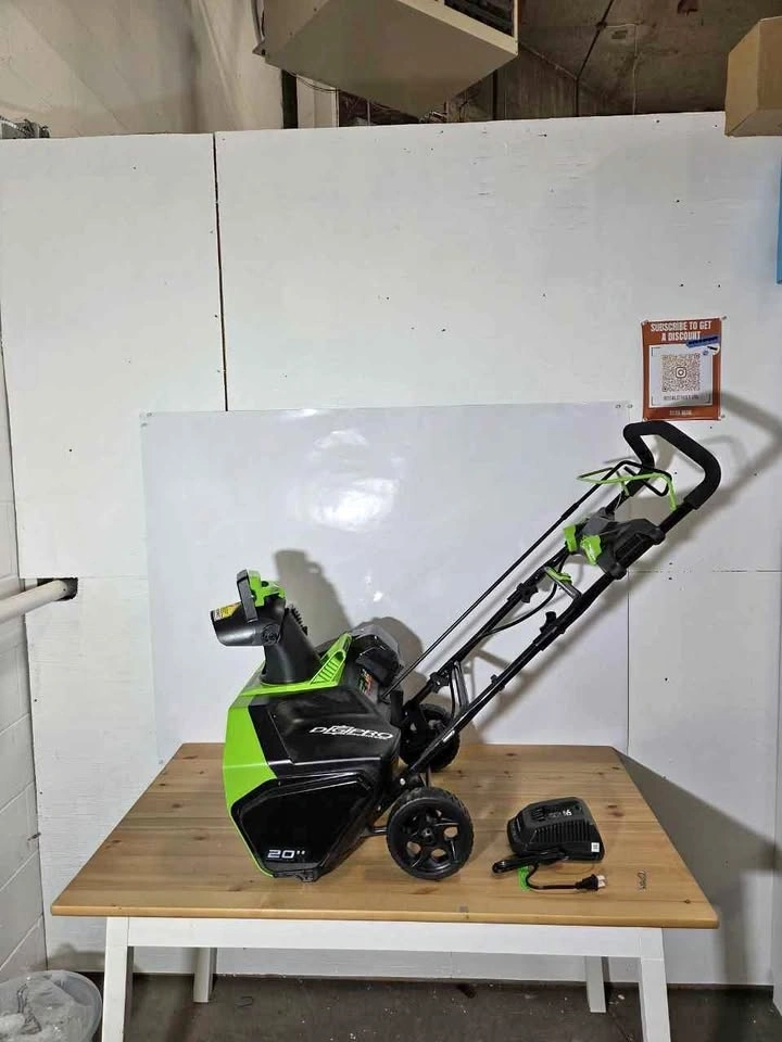 New. 40V cordless power for efficient snow clearing without gas. 20-inch clearing width covers driveways and sidewalks fast. Brushless motor for longer runtime and better performance. Throws snow up to 20 ft for easy removal. Includes battery and charger for ready-to-use setup. Great for home use in winter, easy to handle and store.