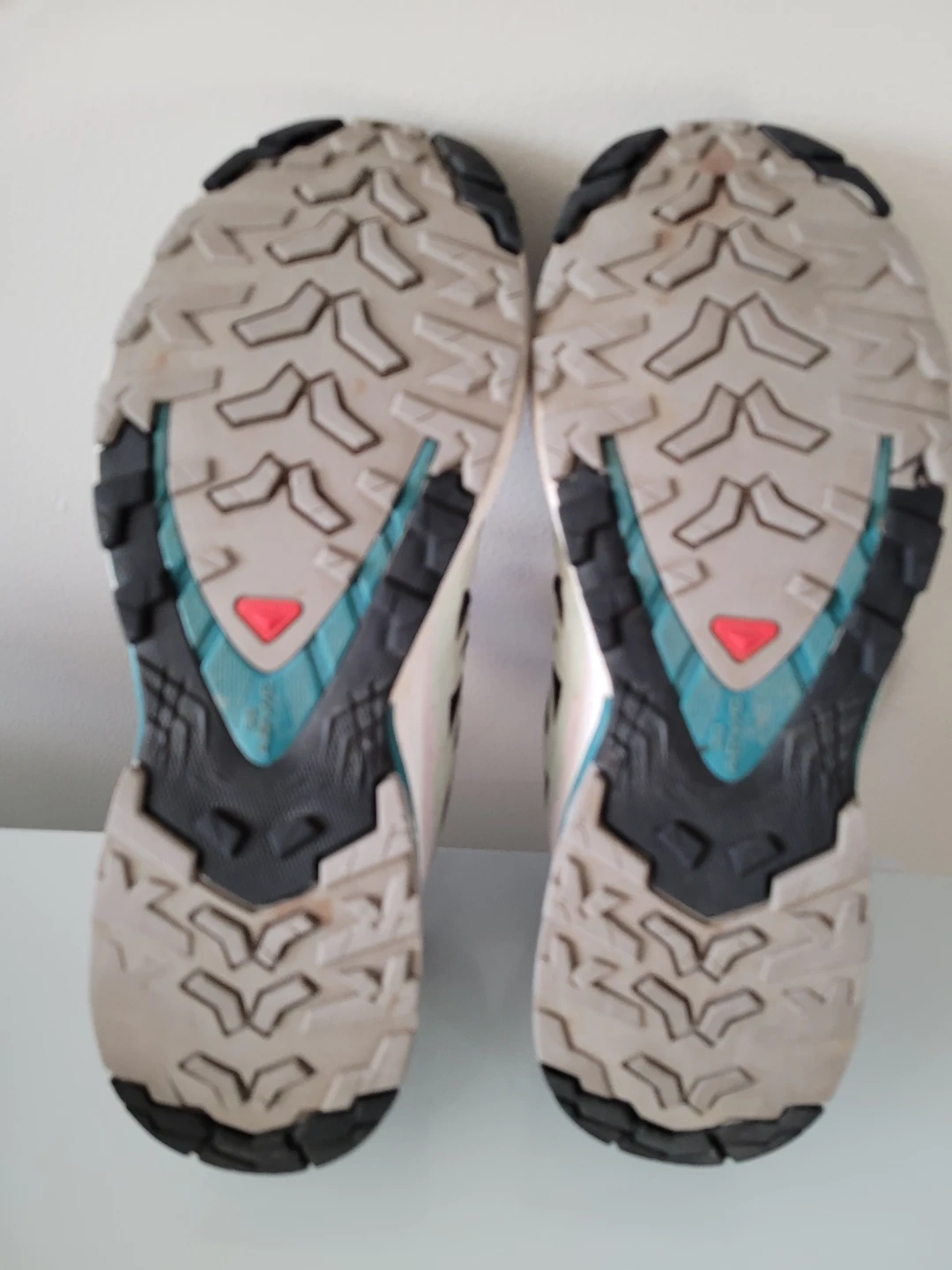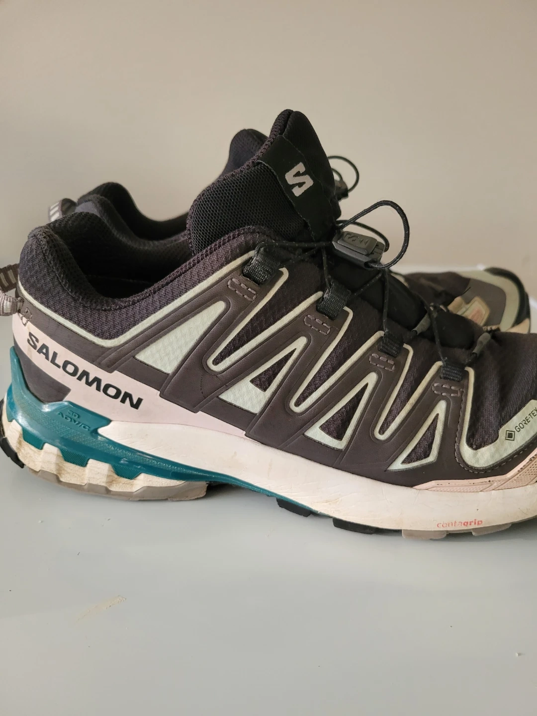 Salomon XA Pro 3D trail running shoes featuring Gore-Tex for waterproofing. These shoes have a quicklace system and OrthoLite insoles. The uppers are a mix of synthetic materials and mesh.