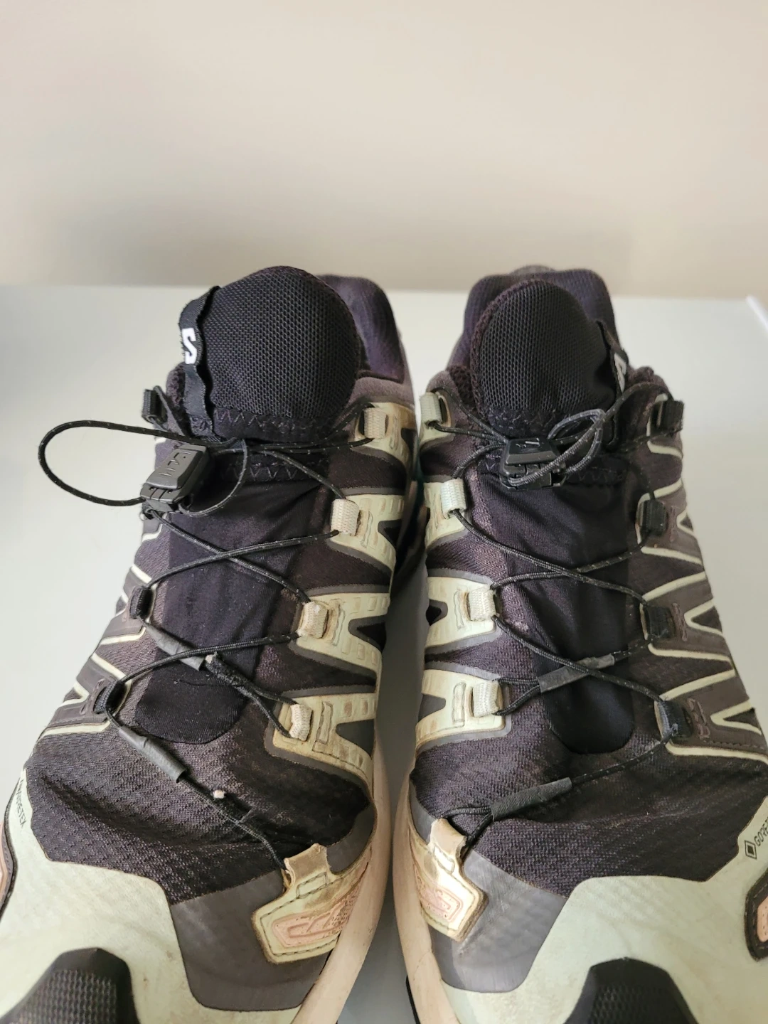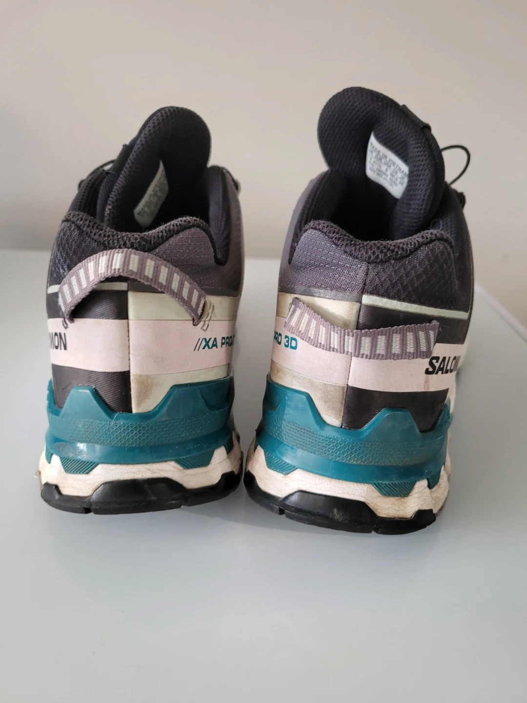 Salomon XA Pro 3D trail running shoes featuring Gore-Tex for waterproofing. These shoes have a quicklace system and OrthoLite insoles. The uppers are a mix of synthetic materials and mesh.