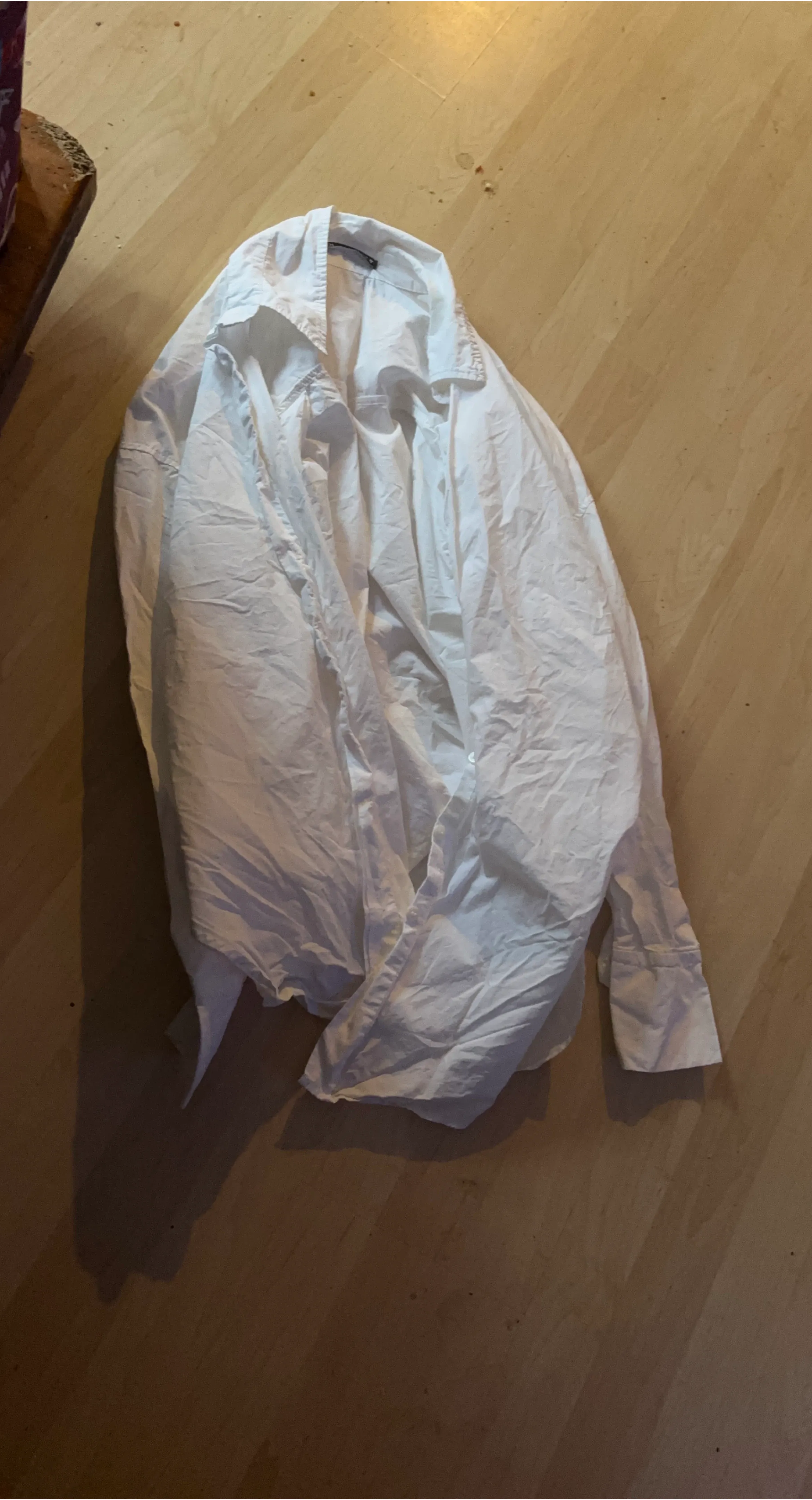 This is a classic white button-up dress shirt. It's made from a lightweight fabric, perfect for layering or wearing on its own. The shirt features a standard collar and button cuffs.