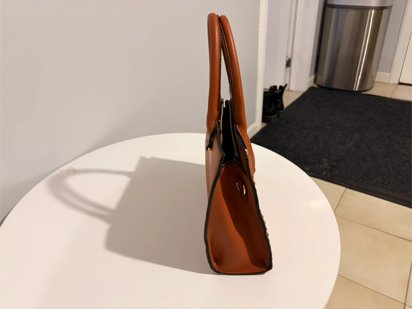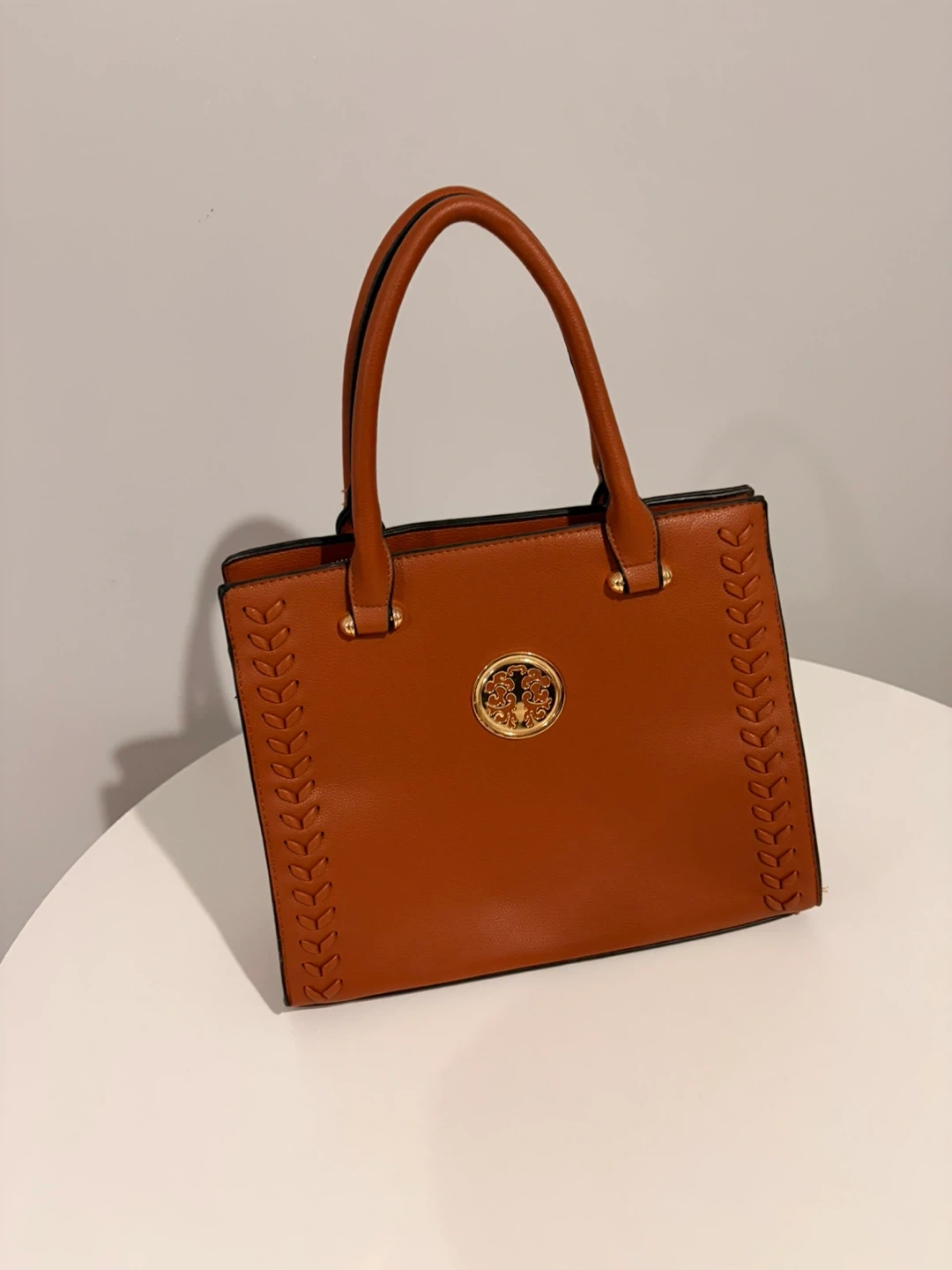 This brown tote handbag is made of faux leather with braided accents on the sides. It features a zippered main compartment. A stylish accessory for everyday use!