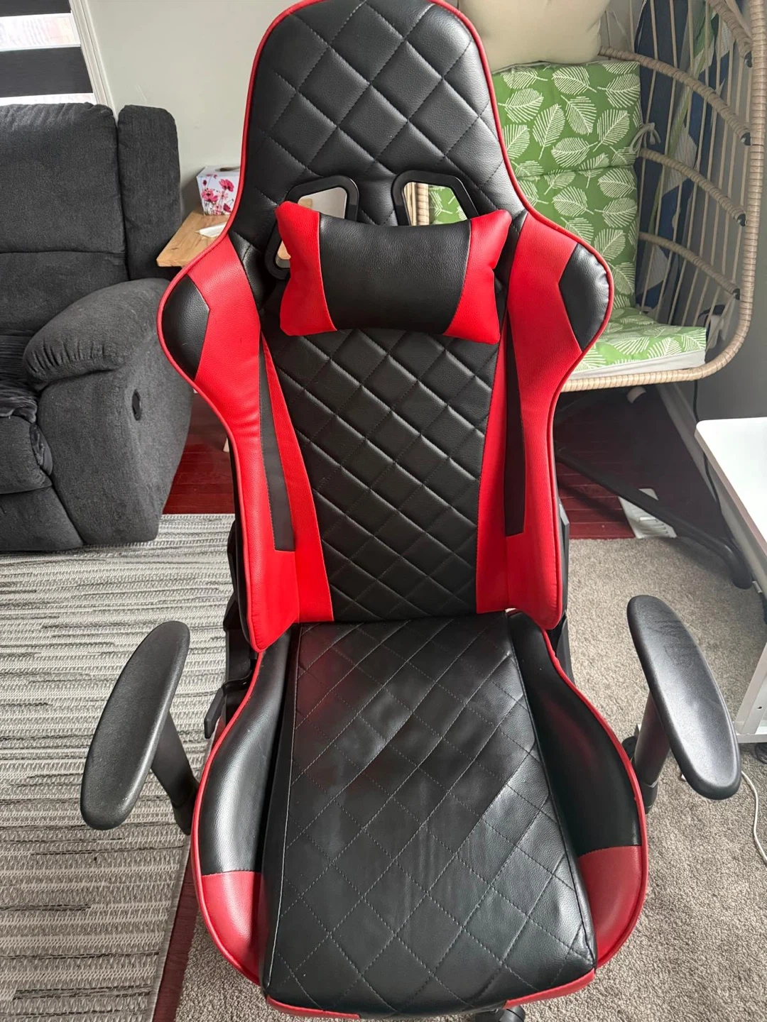 This gaming chair has a quilted black seat and back with red accents. It includes a lumbar pillow and a headrest pillow. Upholstered in faux leather for easy cleaning.