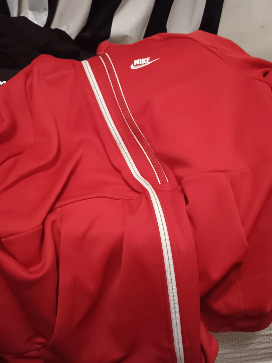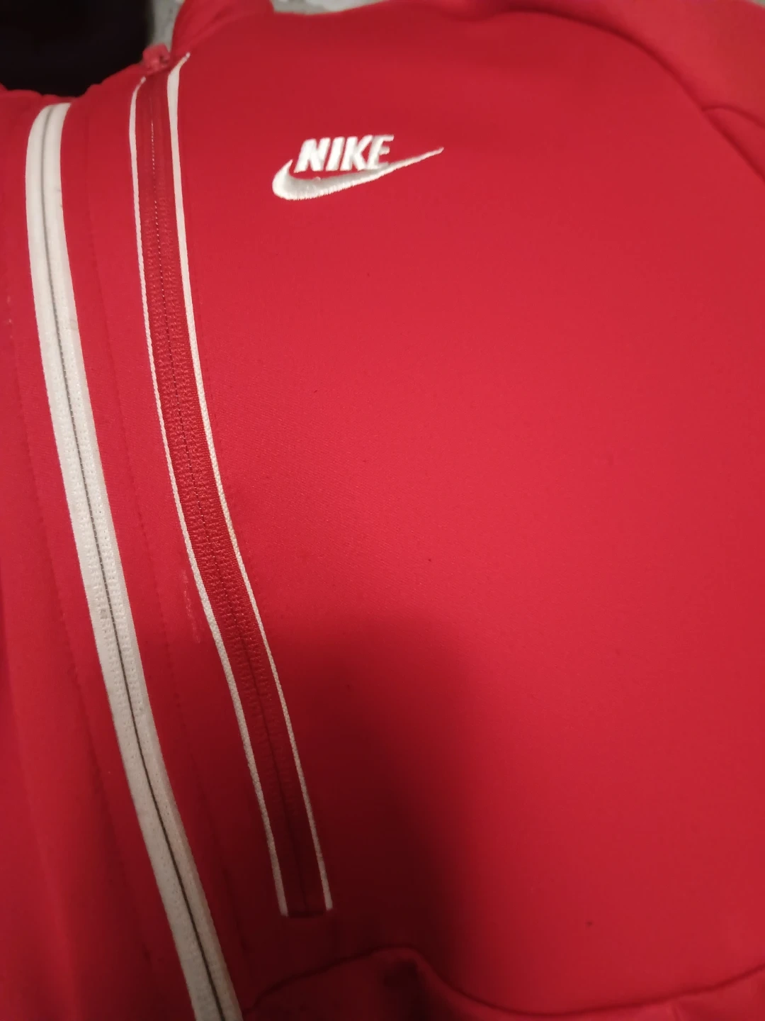 This is a red Nike track jacket with white piping details and a zippered front. It's made from a smooth, athletic material. This jacket is great for casual wear or light workouts!