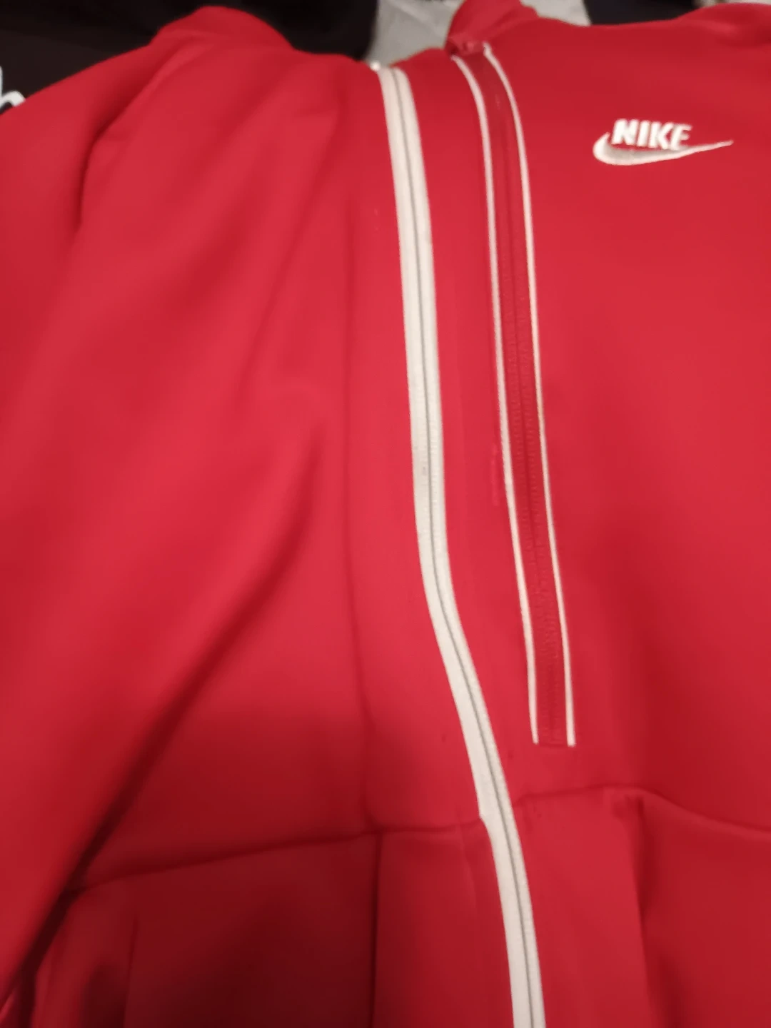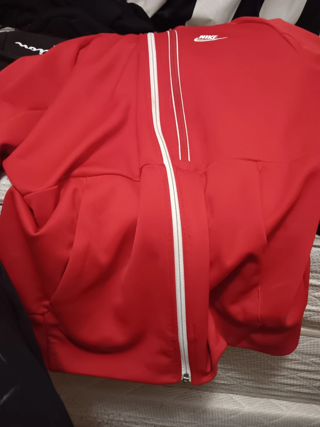 This is a red Nike track jacket with white piping details and a zippered front. It's made from a smooth, athletic material. This jacket is great for casual wear or light workouts!