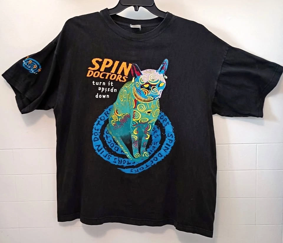 Hard-to-find authentic vintage 1994 Spin Doctors "Turn It Upside Down" world tour shirt with front and sleeve print in great used shape. This is an original and not a recent reprint. 100% heavy-weight cotton. No holes or rips, size extra large (measurements shown in photo). Tag is faded, but reads: Marine Drive. Available at a safe, public meet-up in downtown Kitchener.