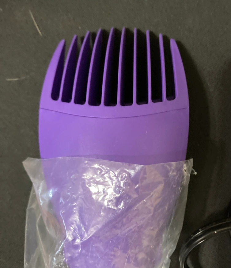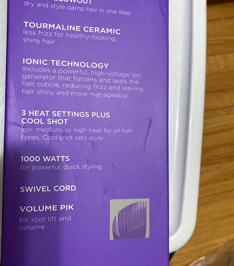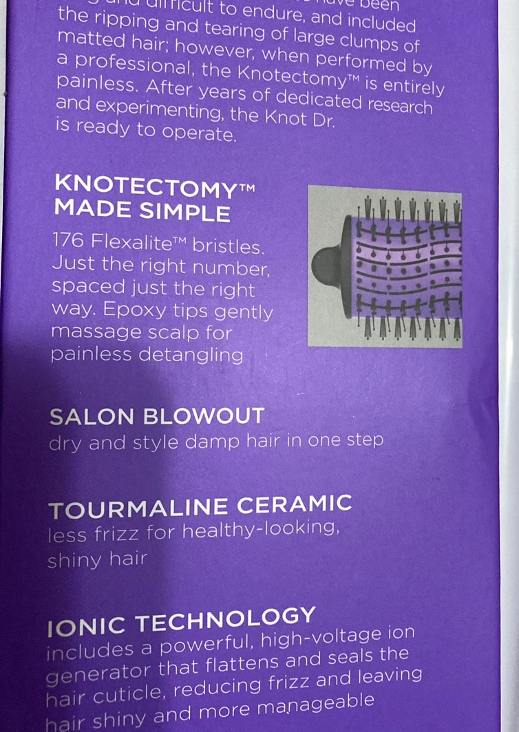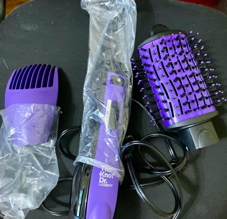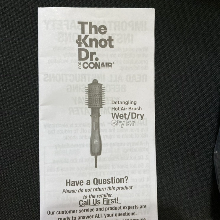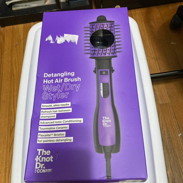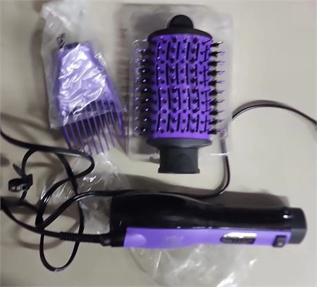 Conair brand. New - was removed from packaging only for testing / photos. The box got a bit scuffed during delivery but everything is working perfectly. Comes with manual and Volume attachment. 1000 watts. 3 heat settings. Can detangle, dry and style. Designed to reduce frizz and give hair a sheen. Lightweight too.