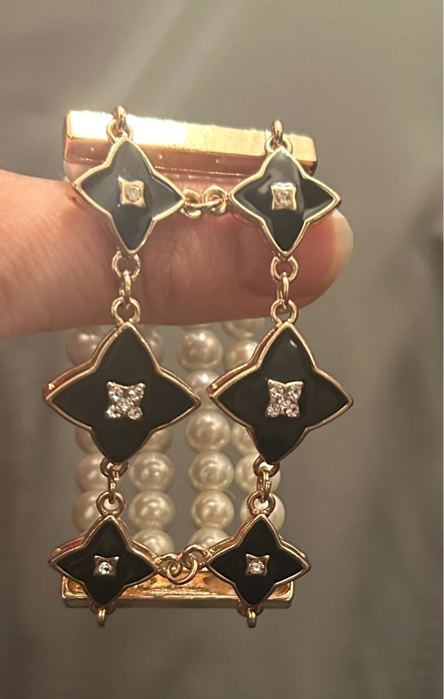 This bracelet features multiple strands of faux pearls. It also has a decorative section with black clover-shaped charms, each with a small faux gem accent. It's a stylish accessory that adds a touch of elegance!