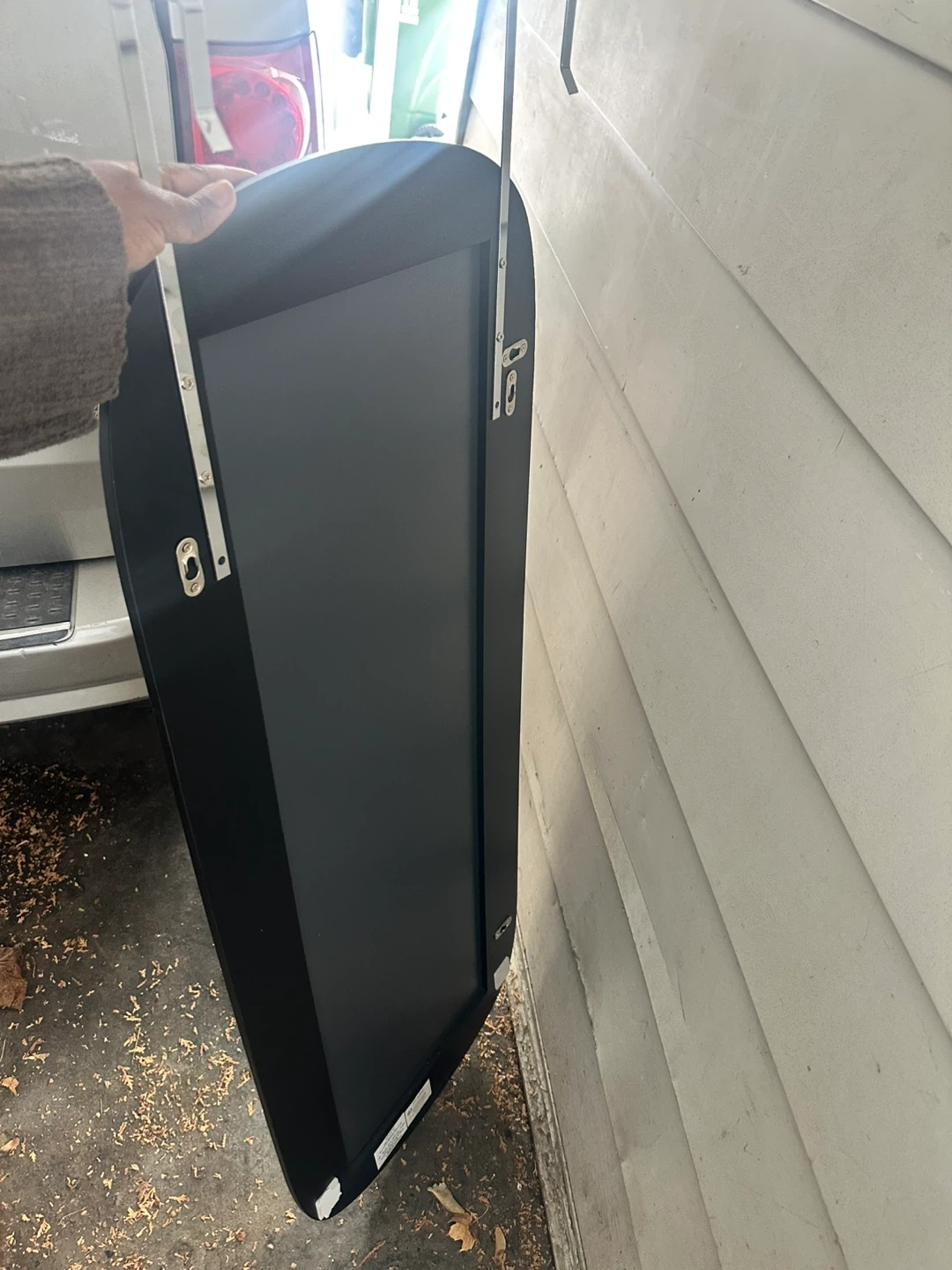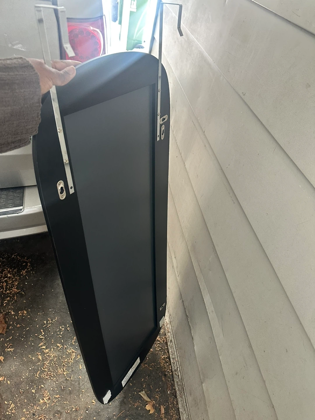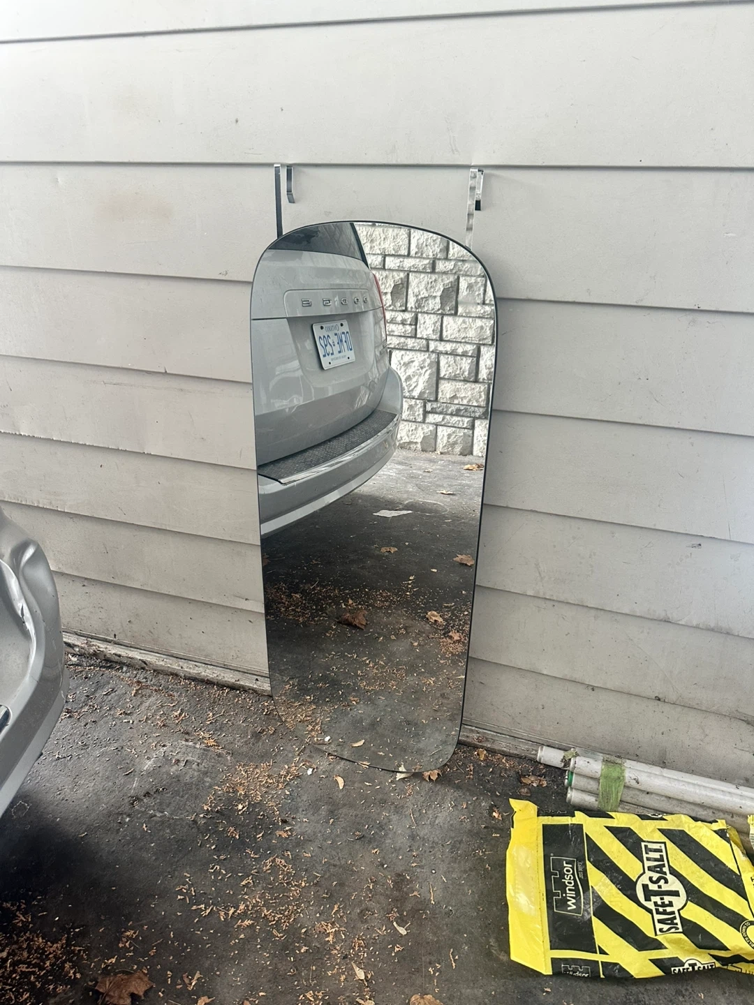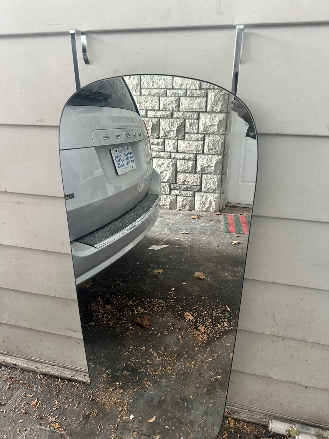 This is a tall, arched mirror with a black backing. It's designed to hang on the wall or door. Perfect for checking your outfit before you head out!