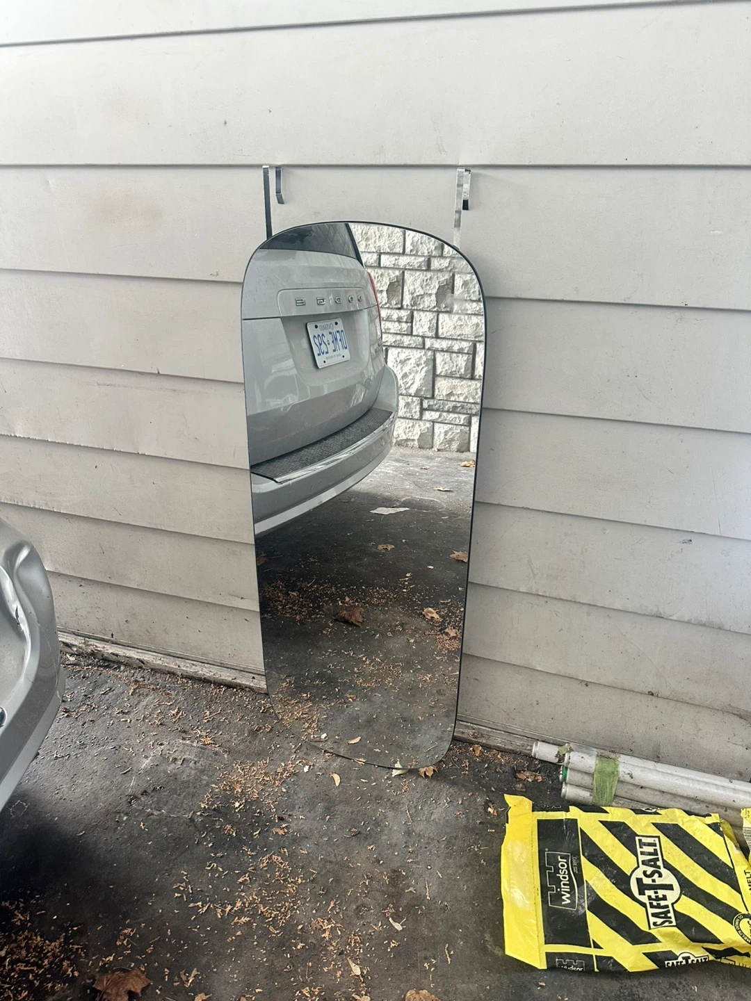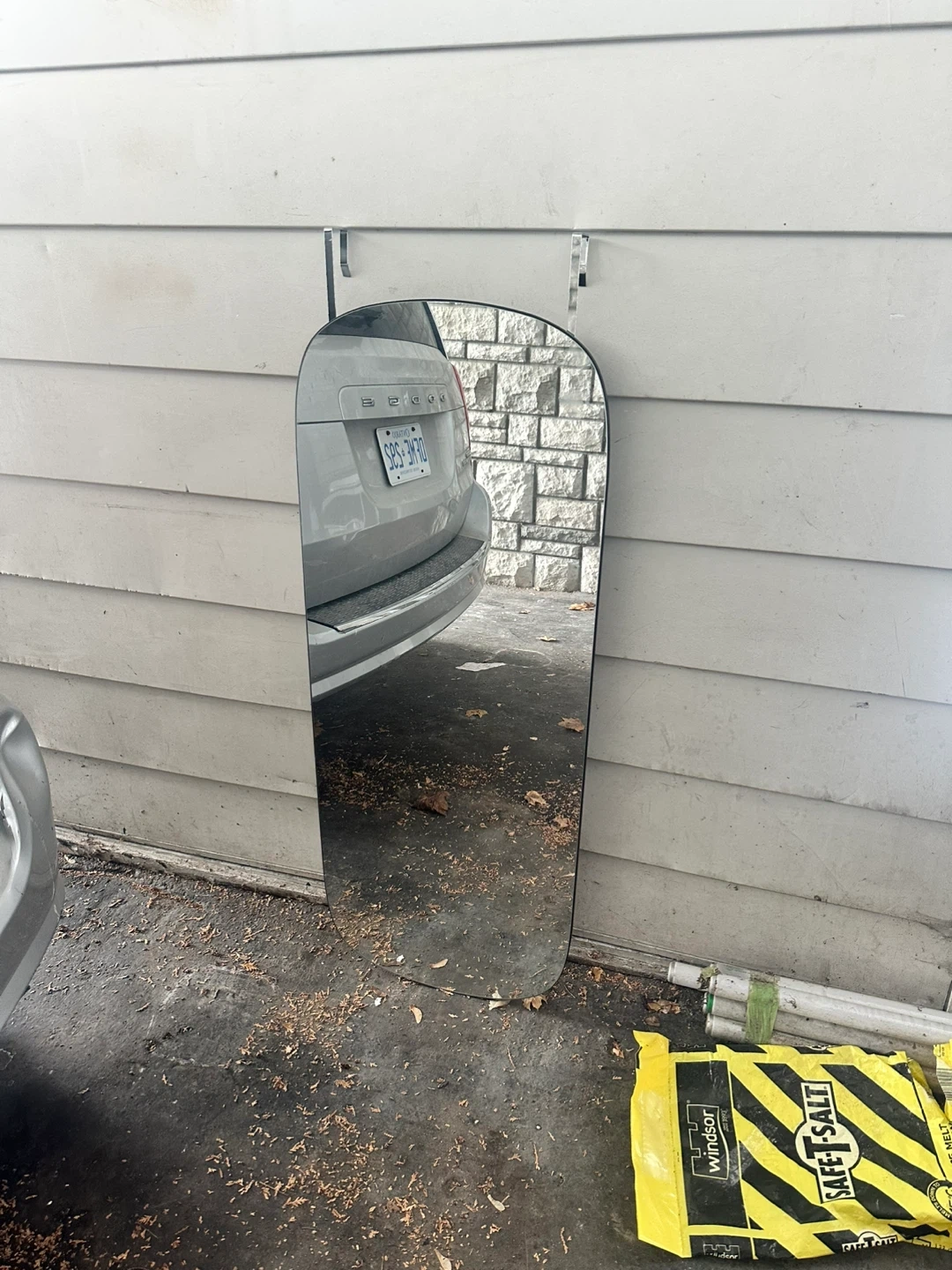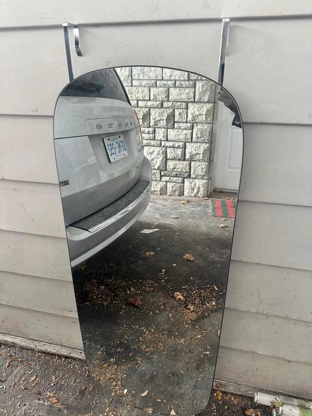 This is a tall, arched mirror with a black backing. It's designed to hang on the wall or door. Perfect for checking your outfit before you head out!