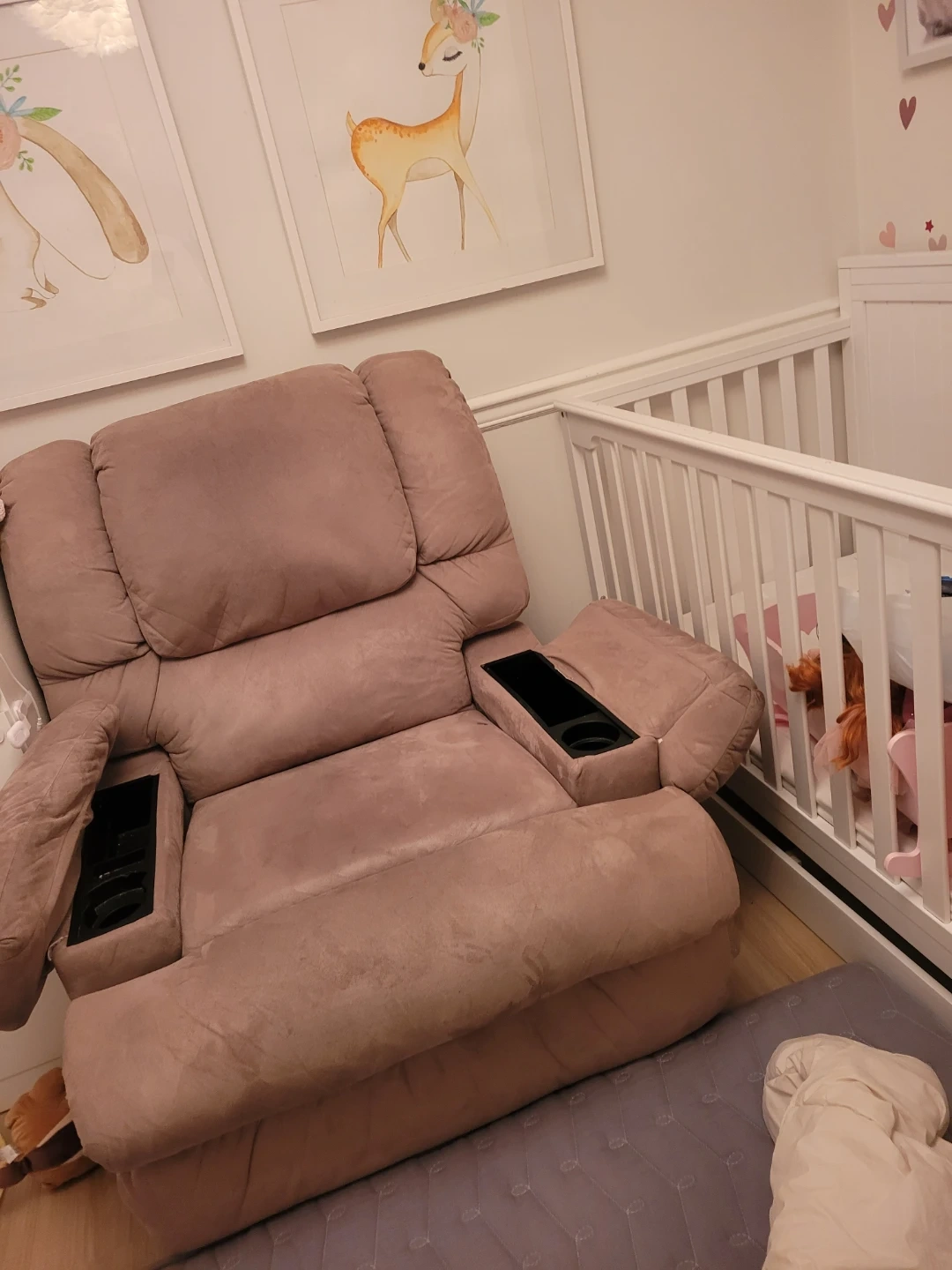 Comfortable recliner chair in a soft brown fabric. Features built-in cup holders for convenience. Perfect for a nursery or living room. I used to put baby to sleep.