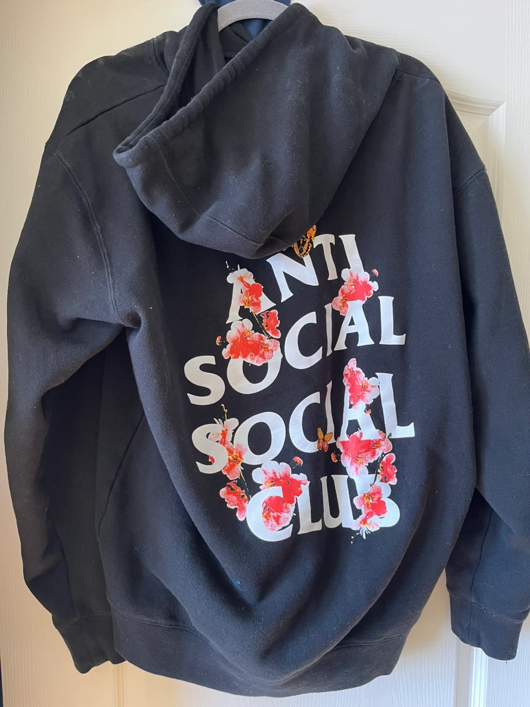 This is a black Anti Social Social Club hoodie with a floral design on the back. It features a front pouch pocket and adjustable drawstring hood. Made from a soft, comfortable material.