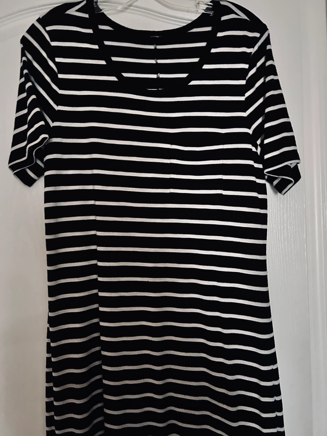 A comfortable, casual maxi dress with black and white stripes. It's made from a soft, stretchy cotton material. This dress is great for everyday wear.