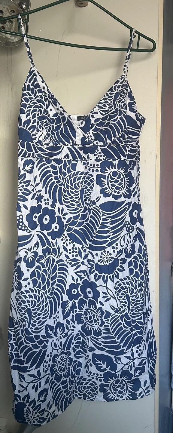 This dress features a stylish blue and white floral print with adjustable spaghetti straps. The fabric is lightweight, making it great for warmer weather.